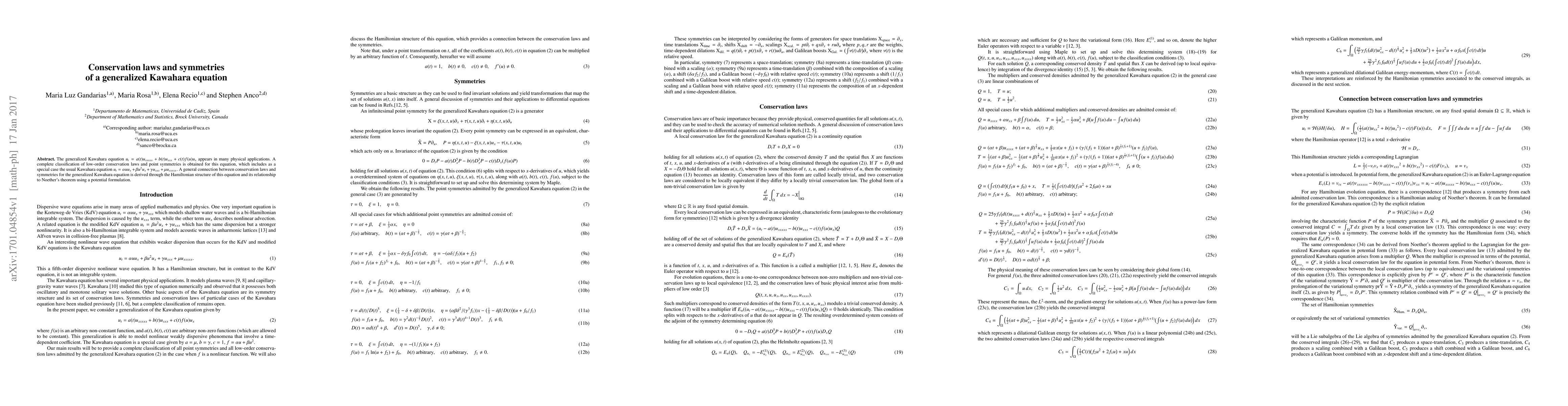 This paper classifies low-order conservation laws and point symmetries for the generalized Kawahara equation, establishing a link between these properties via the equation's Hamiltonian structure and Noether's theorem. It also includes the usual Kawahara equation as a special case.