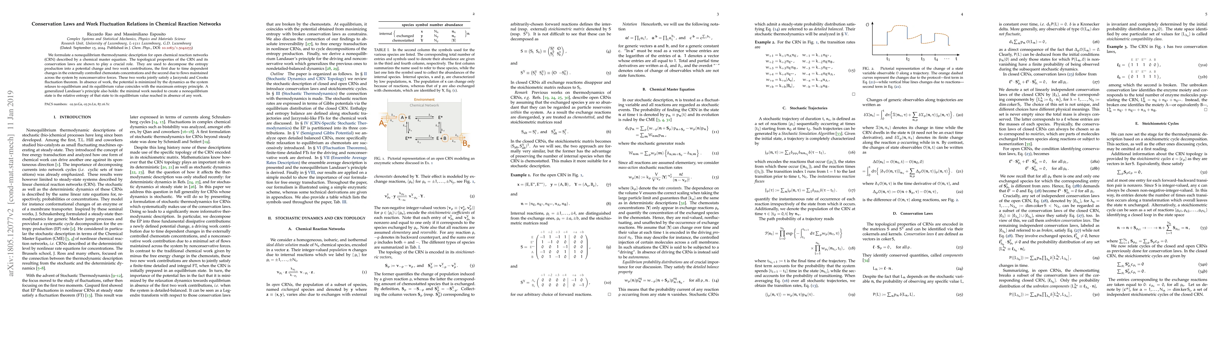 This paper develops a nonequilibrium thermodynamic framework for open chemical reaction networks, demonstrating that conservation laws and network topology are key to decomposing entropy production into potential changes and work contributions. The work contributions satisfy fluctuation theorems, and the minimal work needed to create a nonequilibrium state equals the relative entropy to equilibrium.