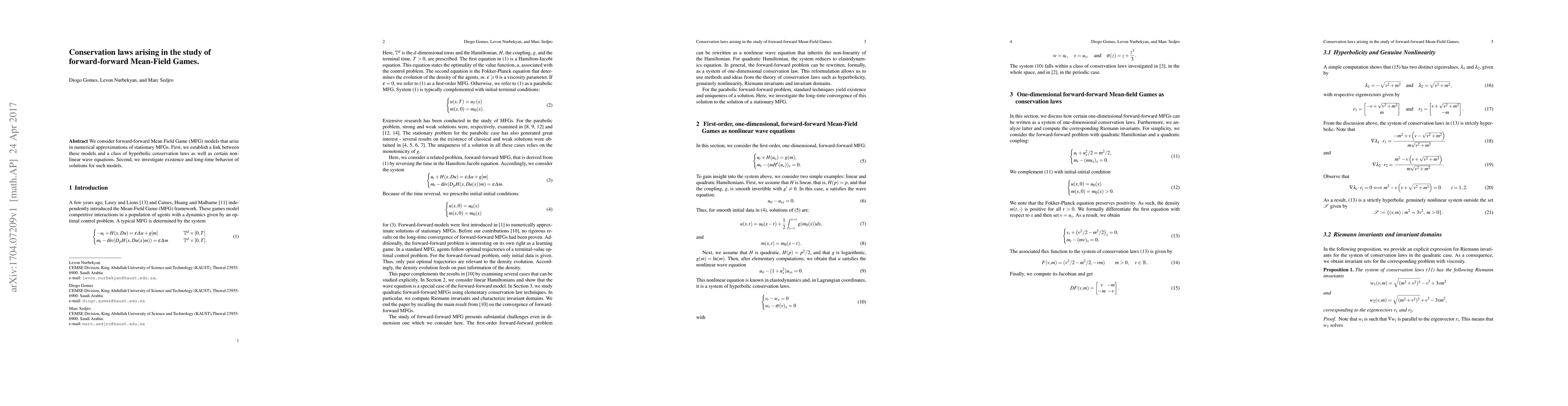 The paper establishes a link between forward-forward Mean-Field Game (MFG) models and hyperbolic conservation laws, investigating existence and long-time behavior of solutions for such models.