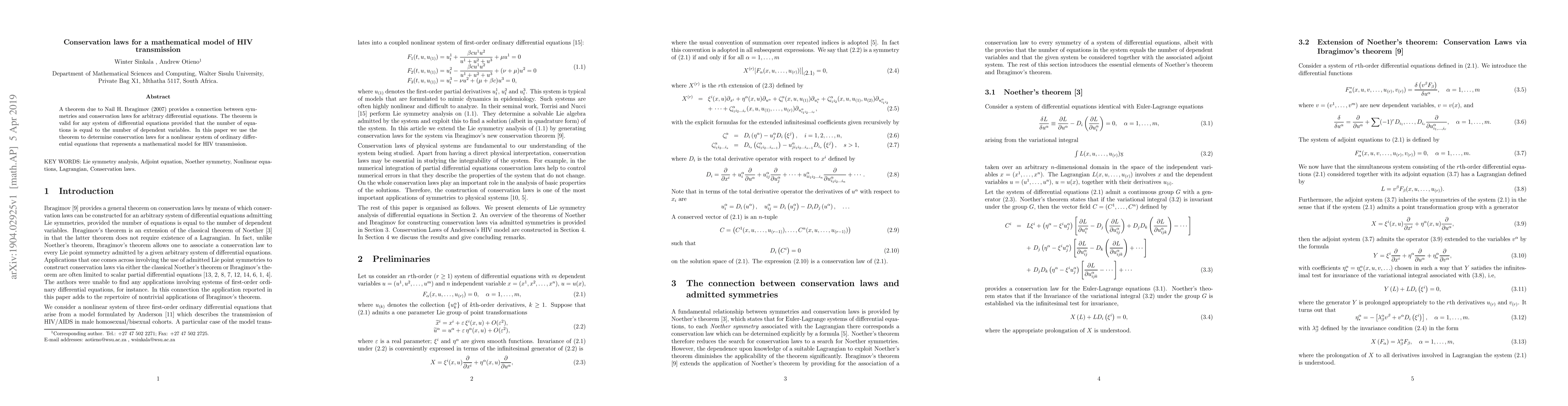 Researchers used a mathematical theorem to identify conservation laws for a model of HIV transmission, revealing new insights into the dynamics of the disease. The study applied a widely applicable theorem to derive conservation laws for a nonlinear system representing HIV transmission.