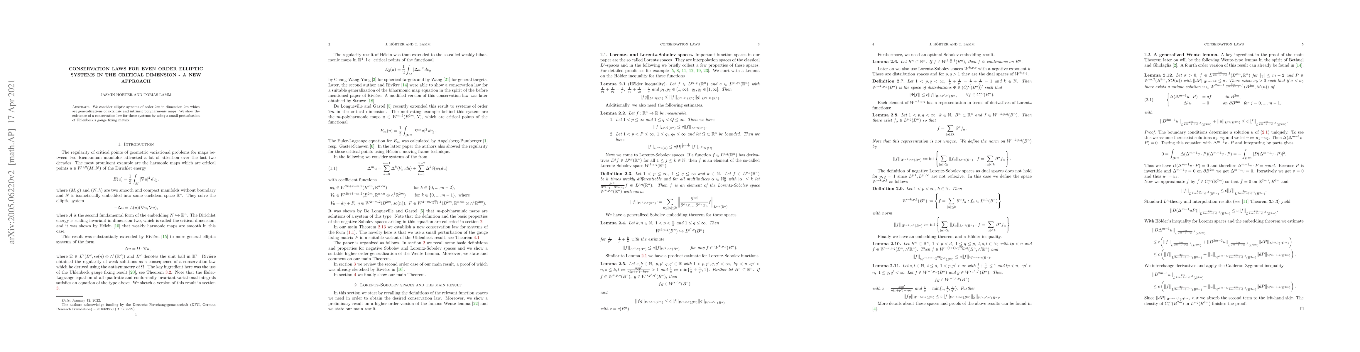 Summary: This paper establishes a conservation law for even order elliptic systems in the critical dimension $2m$, using a novel approach involving a small perturbation of Uhlenbeck's gauge fixing matrix. The method applies to generalizations of extrinsic and intrinsic polyharmonic maps.