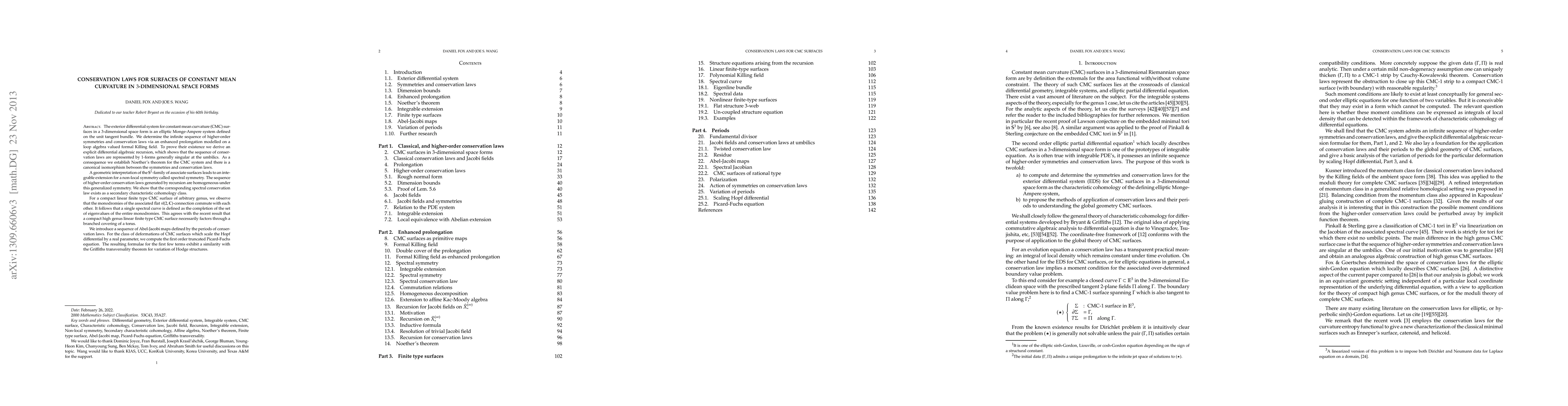 The exterior differential system for constant mean curvature (CMC) surfaces in a 3-dimensional space form is an elliptic Monge-Ampere system defined on the unit tangent bundle. We determine the infinite sequence of higher-order symmetries and conservation laws via an enhanced prolongation modelled on a loop algebra valued formal Killing field. As a consequence we establish Noether's theorem for the CMC system and there is a canonical isomorphism between the symmetries and conservation laws. A geometric interpretation of the $\mathbb{S}^{1}$-family of associate surfaces leads to an integrable extension for a non-local symmetry called spectral symmetry. We show that the corresponding spectral conservation law exists as a secondary characteristic cohomology class. For a compact linear finite type CMC surface of arbitrary genus, we observe that the monodromies of the associated flat $\mathfrak{sl}(2,\mathbb{C})$-connection commute with each other. It follows that a single spectral curve is defined as the completion of the set of eigenvalues of the entire monodromies. This agrees with the recent result that a compact high genus linear finite type CMC surface necessarily factors through a branched covering of a torus. We introduce a sequence of Abel-Jacobi maps defined by the periods of conservation laws. For the class of deformations of CMC surfaces which scale the Hopf differential by a real parameter, we compute the first order truncated Picard-Fuchs equation. The resulting formulae for the first few terms exhibit a similarity with the Griffiths transversality theorem for variation of Hodge structures.