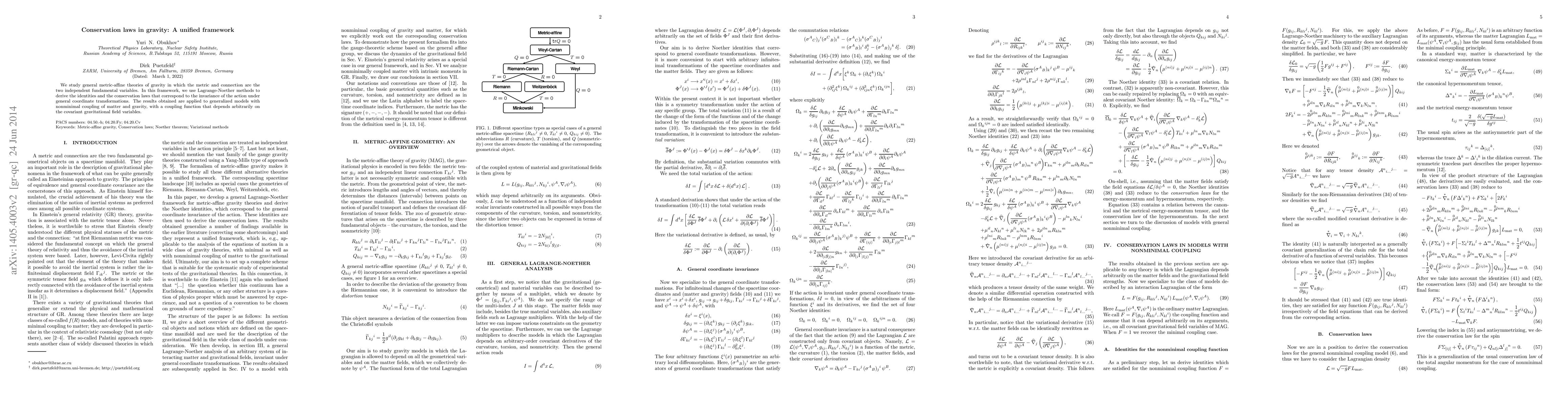 This paper explores general metric-affine theories of gravity, deriving conservation laws using Lagrange-Noether methods based on invariance under coordinate transformations. The findings are applied to models with nonminimal matter-gravity coupling dependent on gravitational field variables.