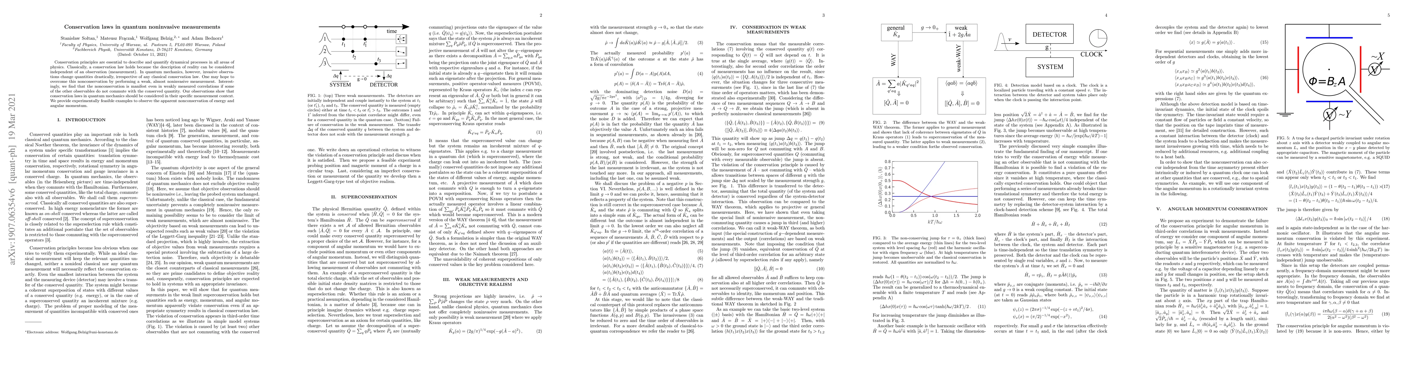 This paper explores conservation laws in quantum mechanics, revealing that even weak, noninvasive measurements can lead to apparent nonconservation of quantities like energy and angular momentum when the measured observables do not commute with the conserved quantities. It emphasizes the need to consider measurement context in quantum conservation laws.