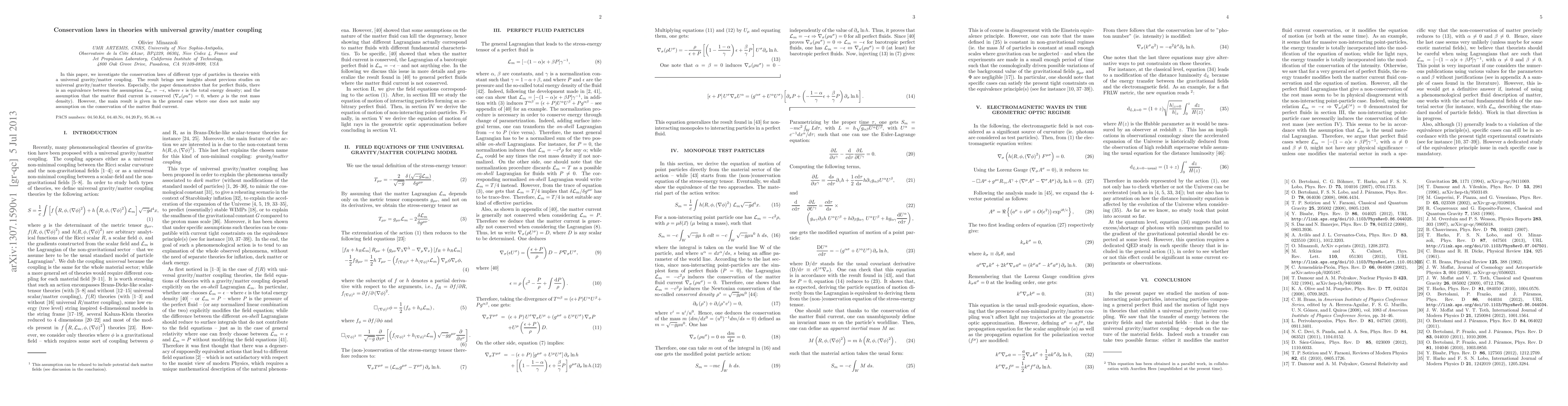 This paper explores conservation laws in theories with universal gravity/matter coupling, revealing an equivalence between energy density assumptions and conserved matter fluid current for perfect fluids, while providing general results without assuming current conservation.