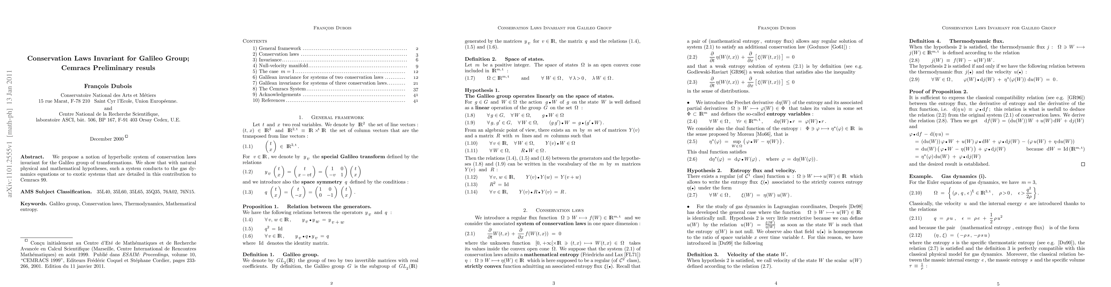 The paper introduces a concept of hyperbolic systems of conservation laws that remain unchanged under Galileo group transformations. It demonstrates that under certain conditions, these systems lead to gas dynamics equations or unconventional systems, as detailed in the Cemracs 99 contribution.