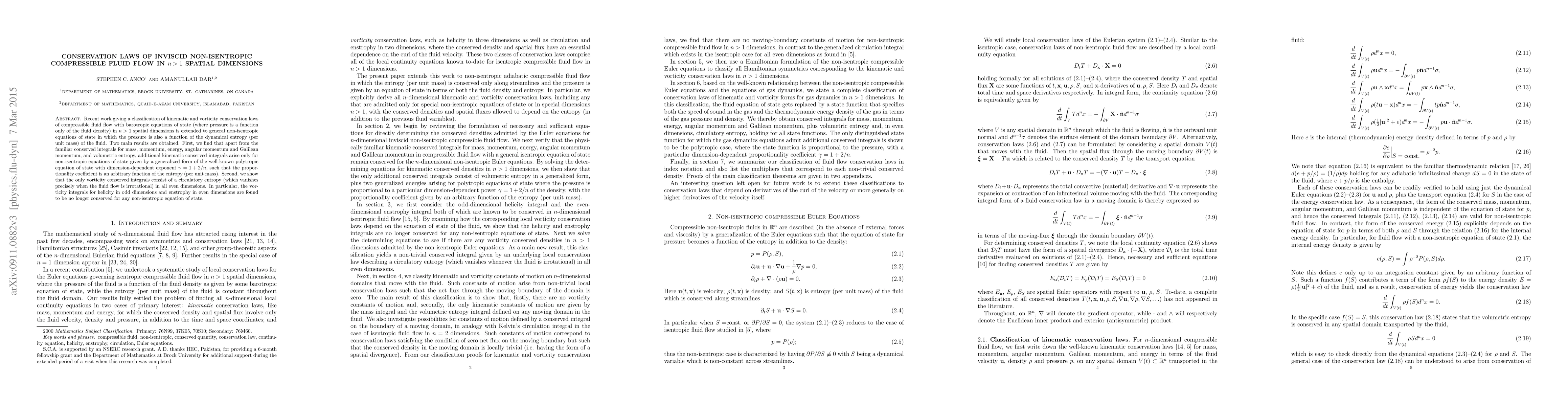 This paper extends the classification of conservation laws for compressible fluid flow in multiple dimensions to non-isentropic equations of state, revealing additional kinematic conserved integrals for non-isentropic polytropic equations and showing that vorticity conserved integrals like helicity and enstrophy are not conserved under non-isentropic conditions.