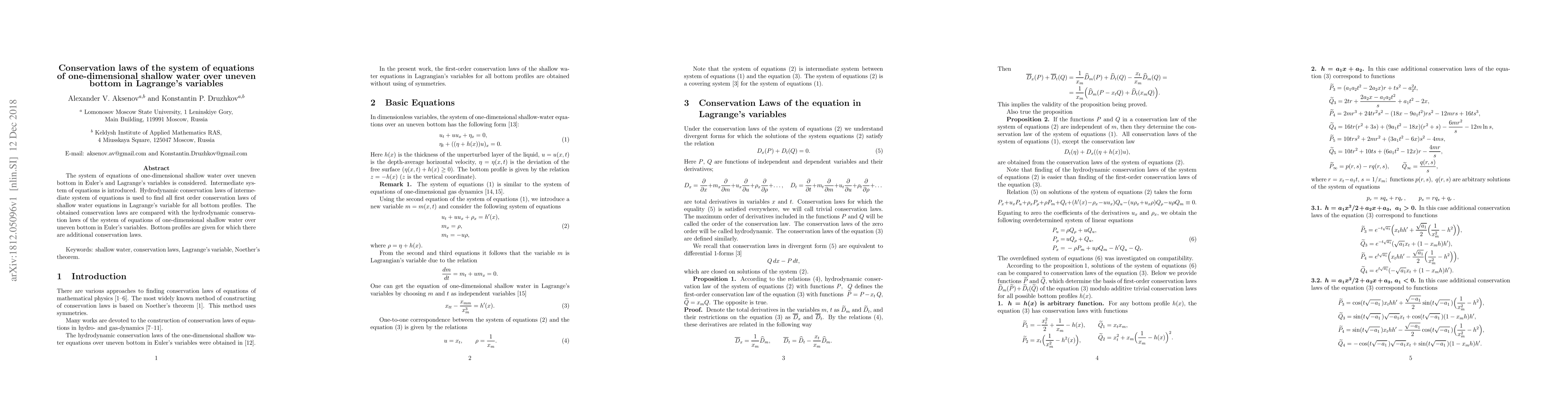 This paper explores the conservation laws of one-dimensional shallow water equations over uneven bottoms, transitioning between Euler's and Lagrange's variables. It identifies first-order conservation laws in Lagrange's variables using an intermediate system, and compares these with Euler's variable formulations, highlighting specific bottom profiles with additional conservation laws.