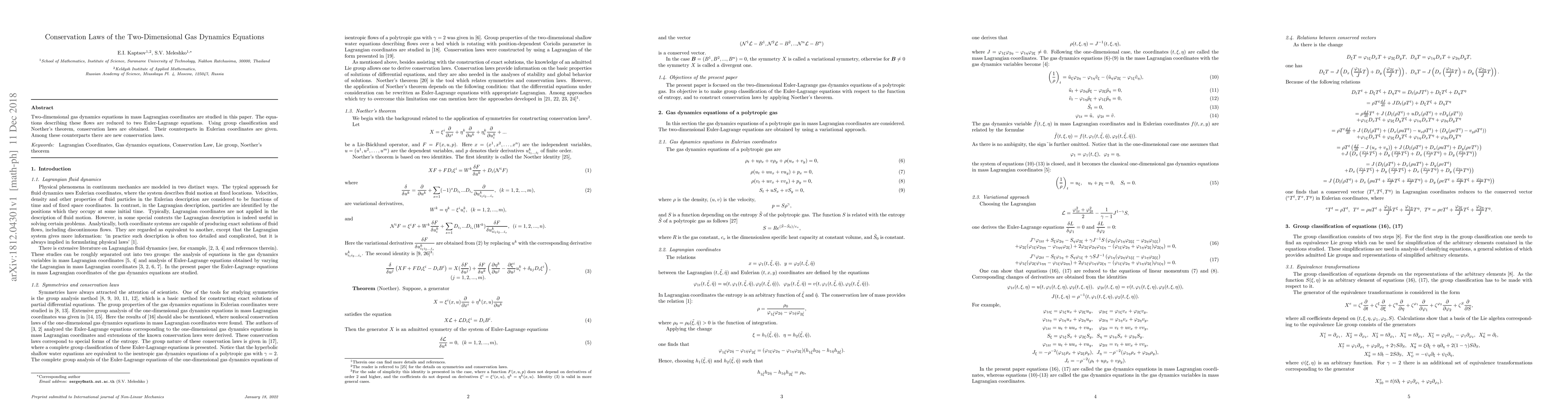 This paper investigates two-dimensional gas dynamics in Lagrangian coordinates, deriving Euler-Lagrange equations and employing group classification and Noether's theorem to find conservation laws. It also presents new conservation laws in their Eulerian counterparts.
