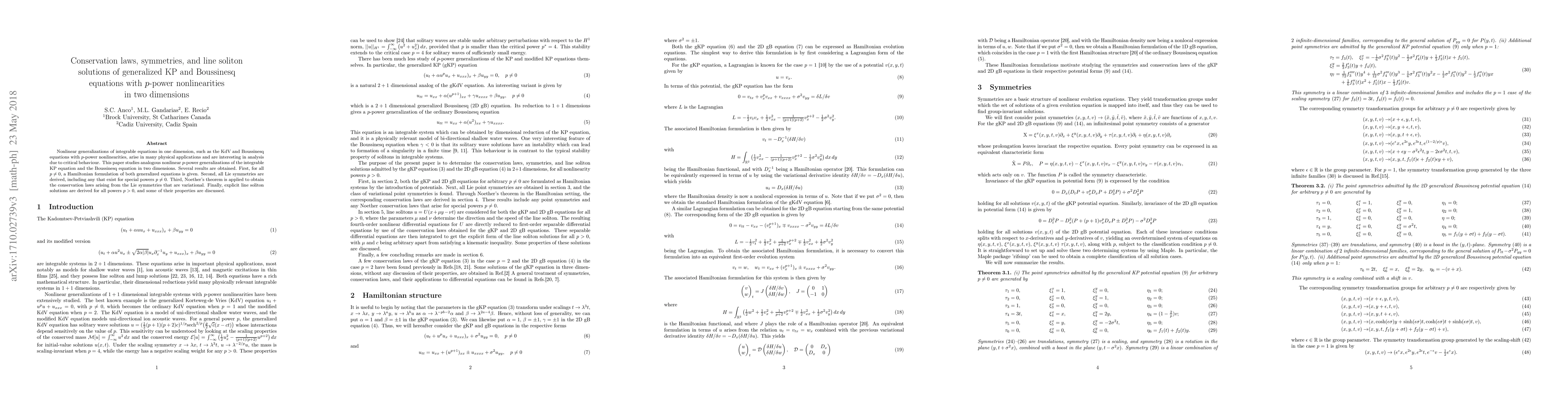 This paper explores generalized two-dimensional KP and Boussinesq equations with $p$-power nonlinearities, deriving Hamiltonian formulations, Lie symmetries, and conservation laws. It also provides explicit line soliton solutions for $p>0$ and discusses their properties.