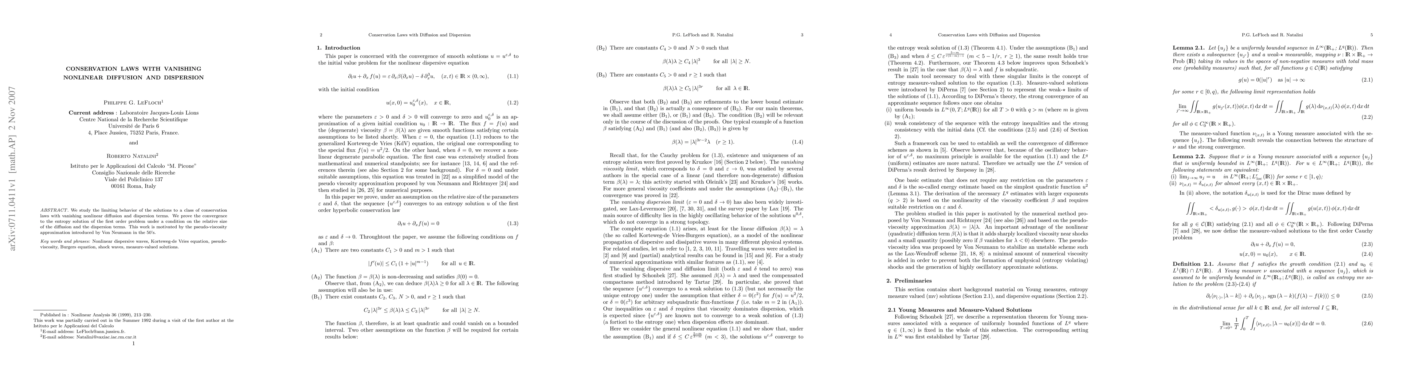 This paper investigates the limiting behavior of solutions to conservation laws with diminishing nonlinear diffusion and dispersion, proving convergence to the entropy solution under specific conditions on these terms, inspired by Von Neumann's pseudo-viscosity approximation.