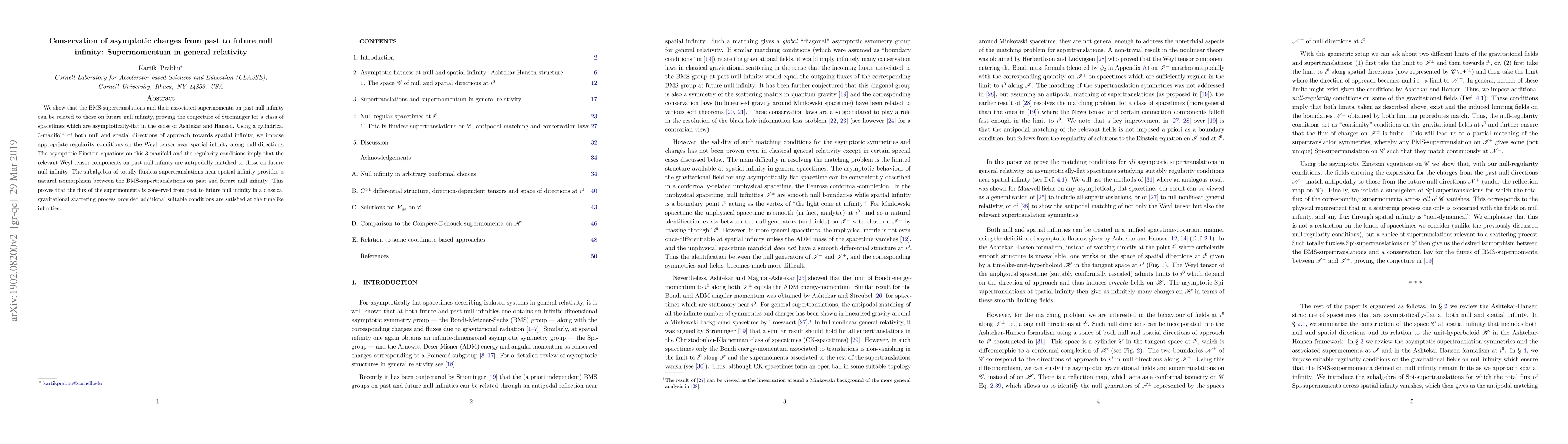 We show that the BMS-supertranslations and their associated supermomenta on past null infinity can be related to those on future null infinity, proving the conjecture of Strominger for a class of spacetimes which are asymptotically-flat in the sense of Ashtekar and Hansen. Using a cylindrical 3-manifold of both null and spatial directions of approach towards spatial infinity, we impose appropriate regularity conditions on the Weyl tensor near spatial infinity along null directions. The asymptotic Einstein equations on this 3-manifold and the regularity conditions imply that the relevant Weyl tensor components on past null infinity are antipodally matched to those on future null infinity. The subalgebra of totally fluxless supertranslations near spatial infinity provides a natural isomorphism between the BMS-supertranslations on past and future null infinity. This proves that the flux of the supermomenta is conserved from past to future null infinity in a classical gravitational scattering process provided additional suitable conditions are satisfied at the timelike infinities.