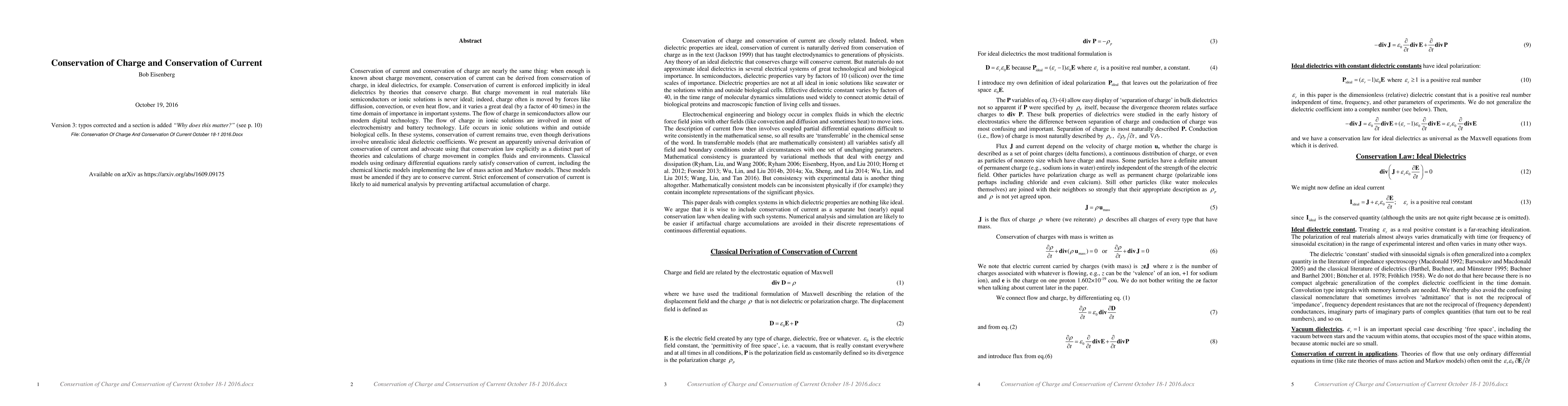 Conservation of current and conservation of charge are nearly the same thing: when enough is known about charge movement, conservation of current can be derived from conservation of charge, in ideal dielectrics, for example. Conservation of current is enforced implicitly in ideal dielectrics by theories that conserve charge. But charge movement in real materials like semiconductors or ionic solutions is never ideal. We present an apparently universal derivation of conservation of current and advocate using that conservation law explicitly as a distinct part of theories and calculations of charge movement in complex fluids and environments. Classical models using ordinary differential equations rarely satisfy conservation of current, including the chemical kinetic models implementing the law of mass action and Markov models. These models must be amended if they are to conserve current. Strict enforcement of conservation of current is likely to aid numerical analysis by preventing artifactual accumulation of charge.
