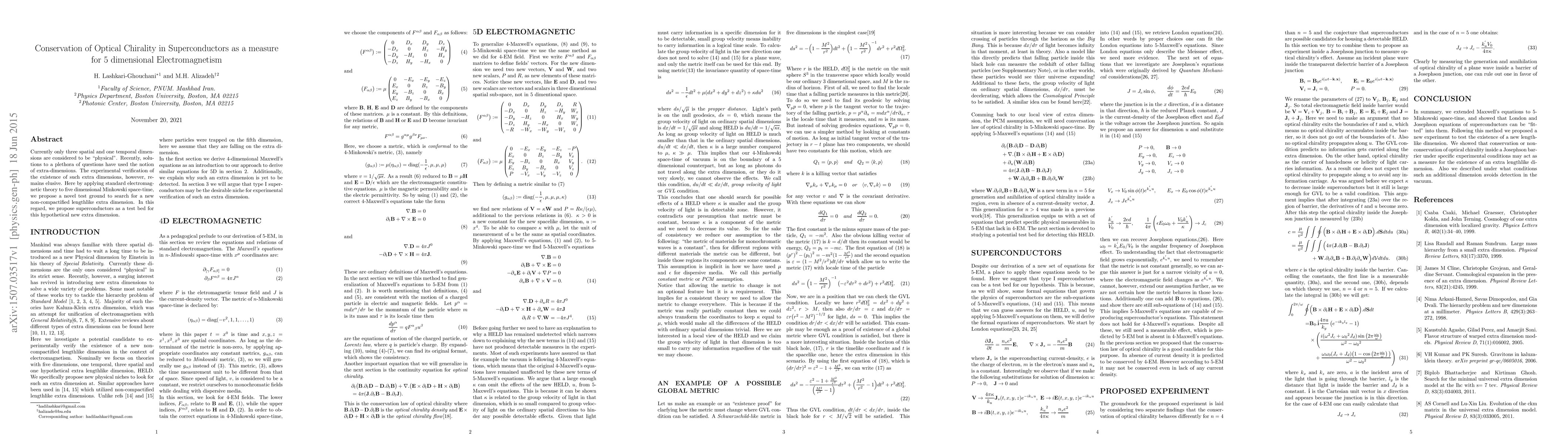 This paper proposes using superconductors to detect a new non-compactified extra dimension in five-dimensional electromagnetism, suggesting that optical chirality conservation in superconductors could serve as a novel experimental measure for verifying the existence of such extra dimensions.