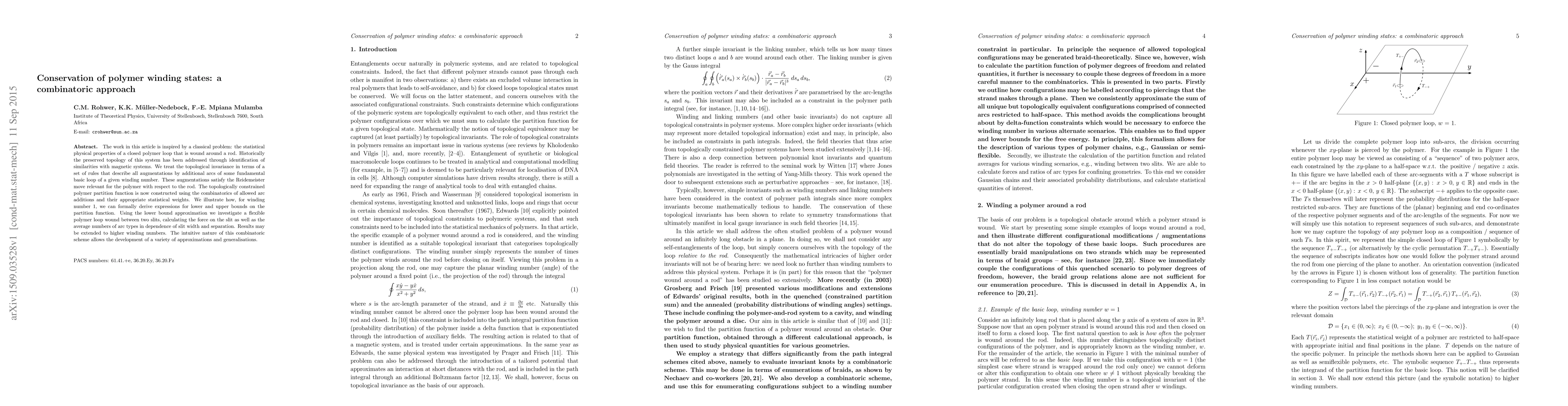The work in this article is inspired by a classical problem: the statistical physical properties of a closed polymer loop that is wound around a rod. Historically the preserved topology of this system has been addressed through identification of similarities with magnetic systems. We treat the topological invariance in terms of a set of rules that describe all augmentations by additional arcs of some fundamental basic loop of a given winding number. These augmentations satisfy the Reidemeister move relevant for the polymer with respect to the rod. The topologically constrained polymer partition function is now constructed using the combinatorics of allowed arc additions and their appropriate statistical weights. We illustrate how, for winding number 1, we can formally derive expressions for lower and upper bounds on the partition function. Using the lower bound approximation we investigate a flexible polymer loop wound between two slits, calculating the force on the slit as well as the average numbers of arc types in dependence of slit width and separation. Results may be extended to higher winding numbers. The intuitive nature of this combinatoric scheme allows the development of a variety of approximations and generalisations.