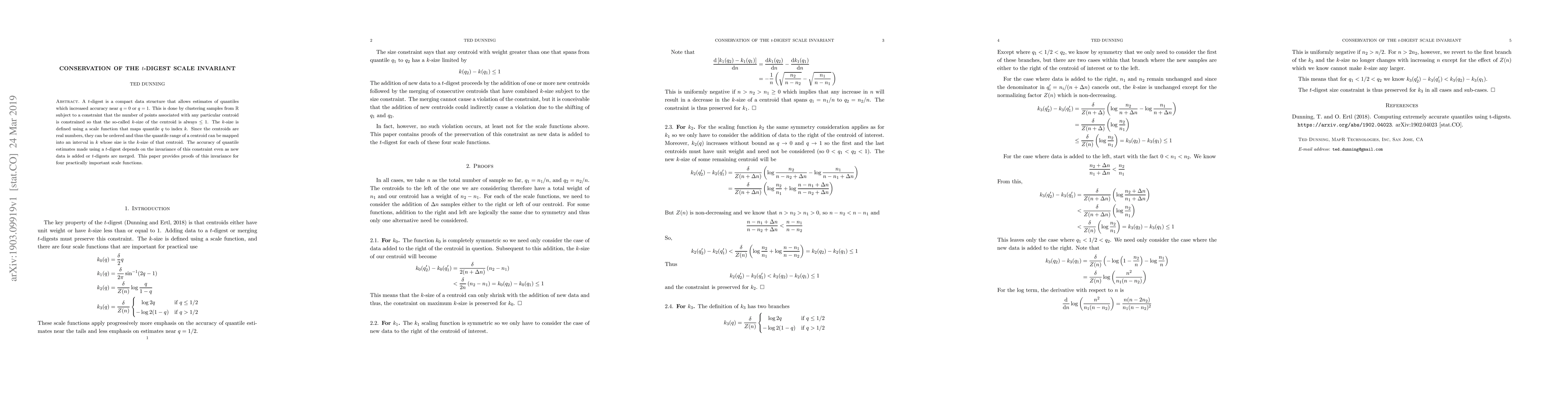 A $t$-digest is a compact data structure that allows estimates of quantiles which increased accuracy near $q = 0$ or $q=1$. This is done by clustering samples from $\mathbb R$ subject to a constraint that the number of points associated with any particular centroid is constrained so that the so-called $k$-size of the centroid is always $\le 1$. The $k$-size is defined using a scale function that maps quantile $q$ to index $k$. Since the centroids are real numbers, they can be ordered and thus the quantile range of a centroid can be mapped into an interval in $k$ whose size is the $k$-size of that centroid. The accuracy of quantile estimates made using a $t$-digest depends on the invariance of this constraint even as new data is added or $t$-digests are merged. This paper provides proofs of this invariance for four practically important scale functions.