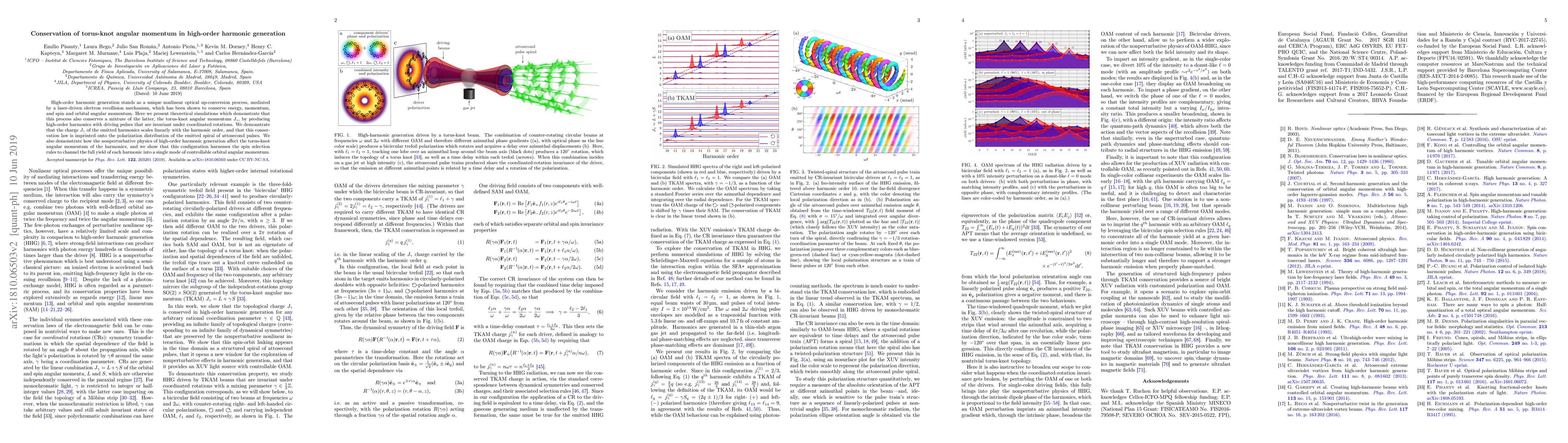 This paper presents theoretical simulations showing that high-order harmonic generation conserves torus-knot angular momentum, $J_\gamma$, which scales linearly with harmonic order and is imprinted on the polarization of emitted attosecond pulses. The study also reveals how nonperturbative physics channels harmonic yield into a single orbital angular momentum mode.