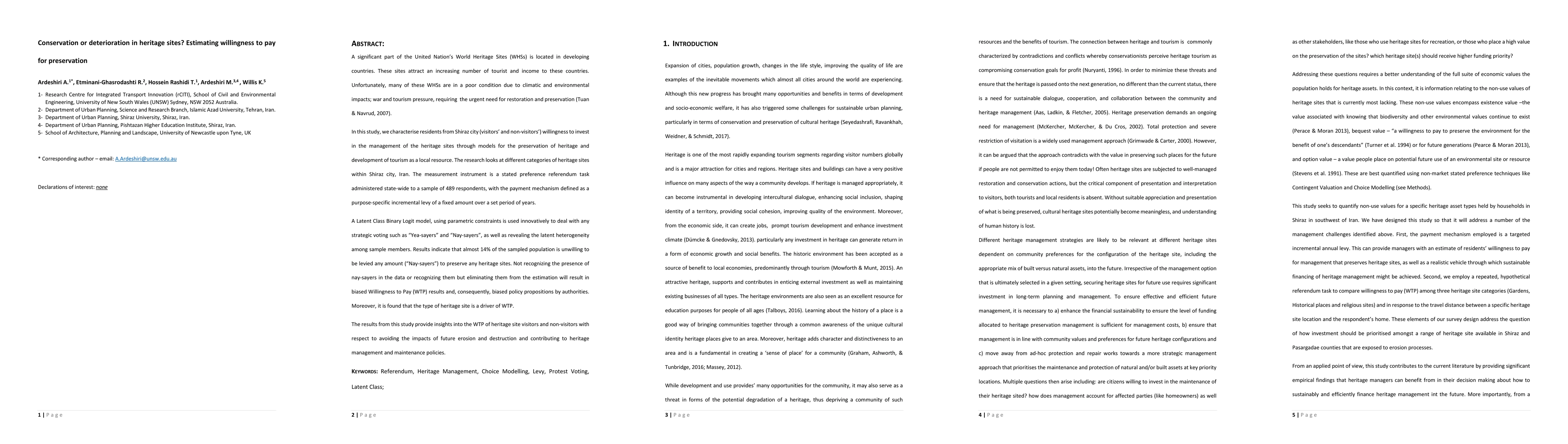 A significant part of the United Nations World Heritage Sites (WHSs) is located in developing countries. These sites attract an increasing number of tourist and income to these countries. Unfortunately, many of these WHSs are in a poor condition due to climatic and environmental impacts; war and tourism pressure, requiring the urgent need for restoration and preservation (Tuan & Navrud, 2007). In this study, we characterise residents from Shiraz city (visitors and non-visitors) willingness to invest in the management of the heritage sites through models for the preservation of heritage and development of tourism as a local resource. The research looks at different categories of heritage sites within Shiraz city, Iran. The measurement instrument is a stated preference referendum task administered state-wide to a sample of 489 respondents, with the payment mechanism defined as a purpose-specific incremental levy of a fixed amount over a set period of years. A Latent Class Binary Logit model, using parametric constraints is used innovatively to deal with any strategic voting such as Yea-sayers and Nay-sayers, as well as revealing the latent heterogeneity among sample members. Results indicate that almost 14% of the sampled population is unwilling to be levied any amount (Nay-sayers) to preserve any heritage sites. Not recognizing the presence of nay-sayers in the data or recognizing them but eliminating them from the estimation will result in biased Willingness to Pay (WTP) results and, consequently, biased policy propositions by authorities. Moreover, it is found that the type of heritage site is a driver of WTP. The results from this study provide insights into the WTP of heritage site visitors and non-visitors with respect to avoiding the impacts of future erosion and destruction and contributing to heritage management and maintenance policies.