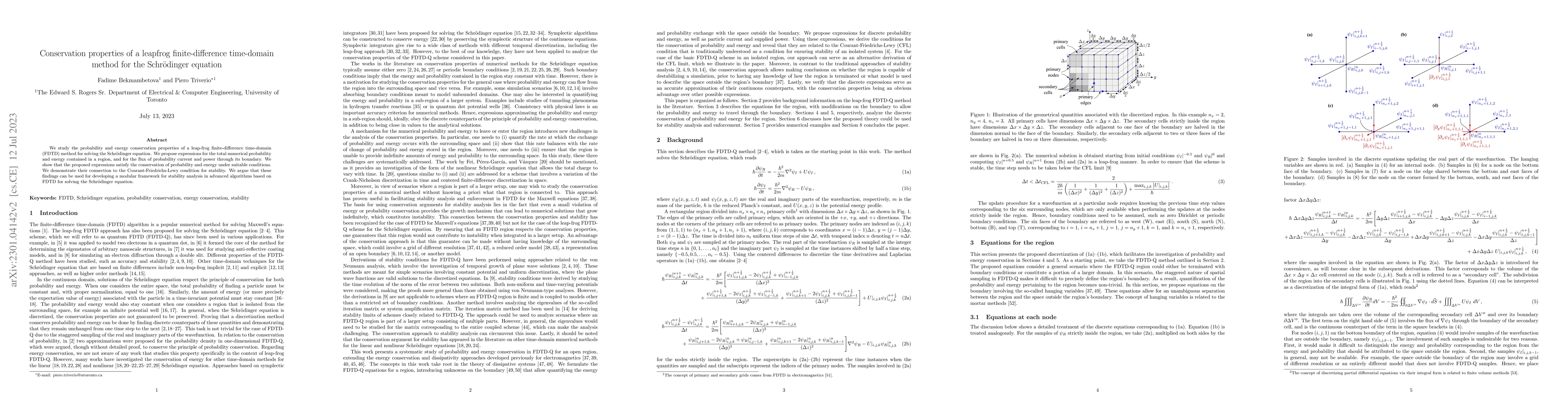This paper investigates the conservation properties of a leapfrog finite-difference time-domain method for solving the Schrödinger equation, proposing expressions for numerical probability and energy conservation that satisfy these properties under specific conditions. The findings connect to the stability condition and suggest a framework for stability analysis in advanced FDTD algorithms.