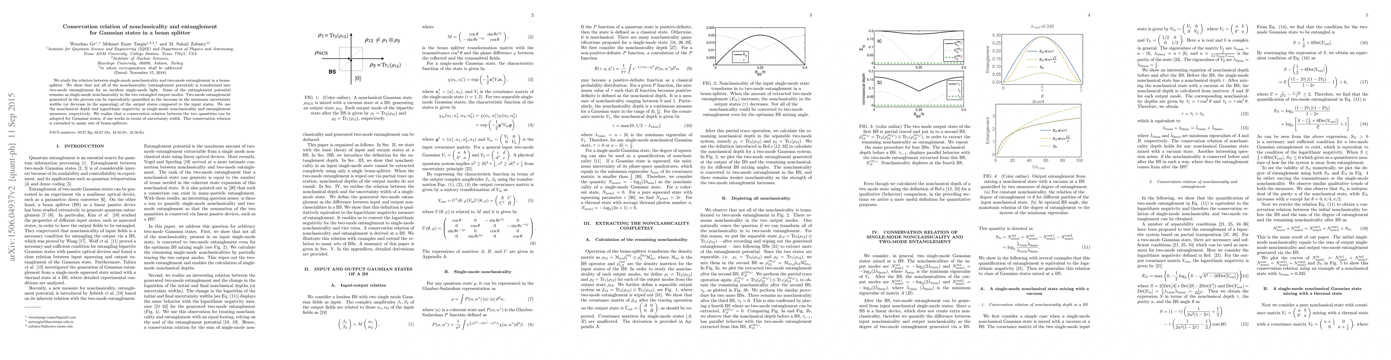 This paper investigates the relationship between single-mode nonclassicality and two-mode entanglement in Gaussian states passing through a beam-splitter. It reveals that not all nonclassicality transforms into two-mode entanglement, with some remaining as single-mode nonclassicality in the output modes. The study proposes a conservation relation between nonclassical depth and logarithmic negativity, expressed in terms of uncertainty widths.