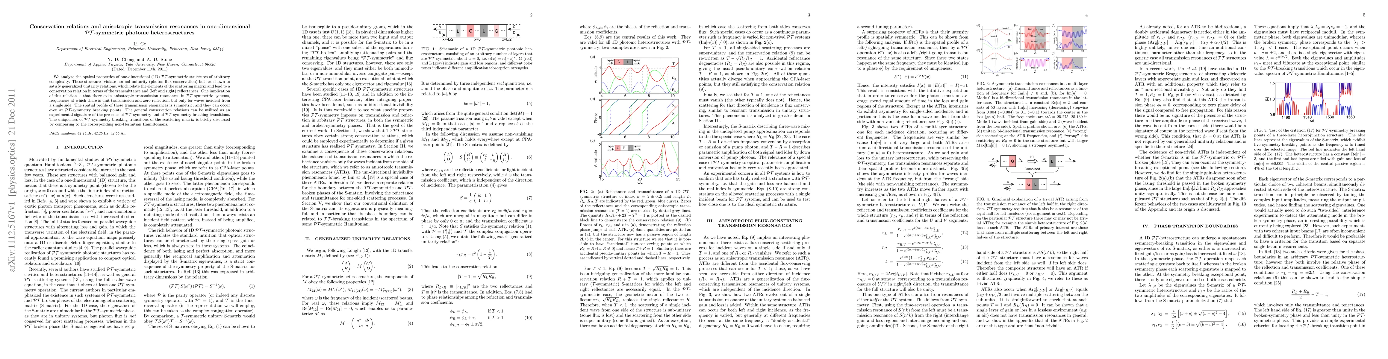 We analyze the optical properties of one-dimensional (1D) PT-symmetric structures of arbitrary complexity. These structures violate normal unitarity (photon flux conservation) but are shown to satisfy generalized unitarity relations, which relate the elements of the scattering matrix and lead to a conservation relation in terms of the transmittance and (left and right) reflectances. One implication of this relation is that there exist anisotropic transmission resonances in PT-symmetric systems, frequencies at which there is unit transmission and zero reflection, but only for waves incident from a single side. The spatial profile of these transmission resonances is symmetric, and they can occur even at PT-symmetry breaking points. The general conservation relations can be utilized as an experimental signature of the presence of PT-symmetry and of PT-symmetry breaking transitions. The uniqueness of PT-symmetry breaking transitions of the scattering matrix is briefly discussed by comparing to the corresponding non-Hermitian Hamiltonians.