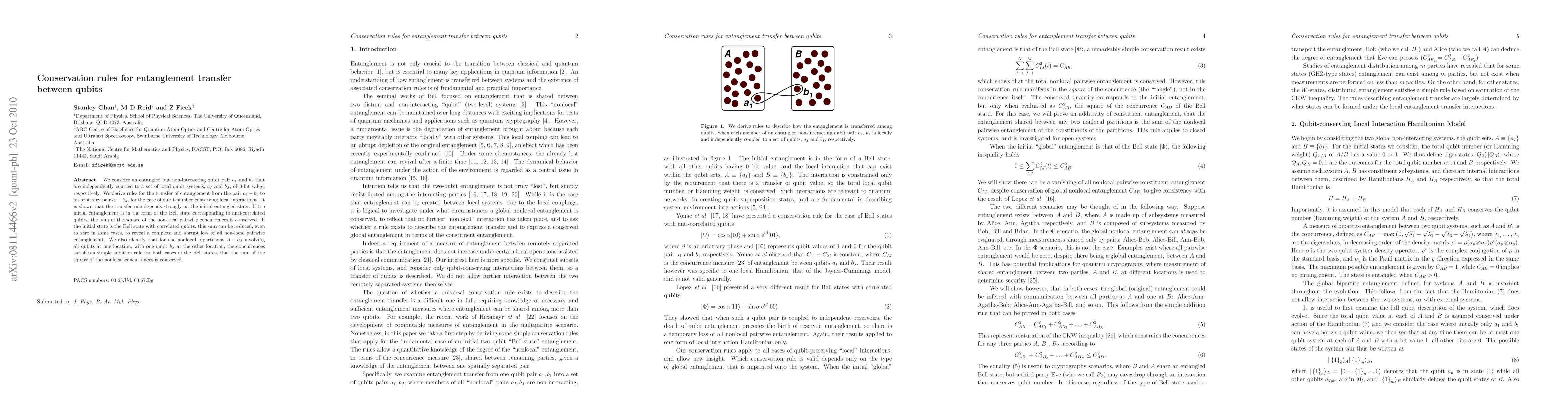 This paper derives rules for the entanglement transfer between qubits under qubit-number conserving local interactions, showing that the transfer depends on the initial entangled state. For Bell states with anti-correlated qubits, the sum of the square of non-local pairwise concurrences is conserved, while for correlated qubits, this sum can decrease, leading to a complete loss of entanglement.