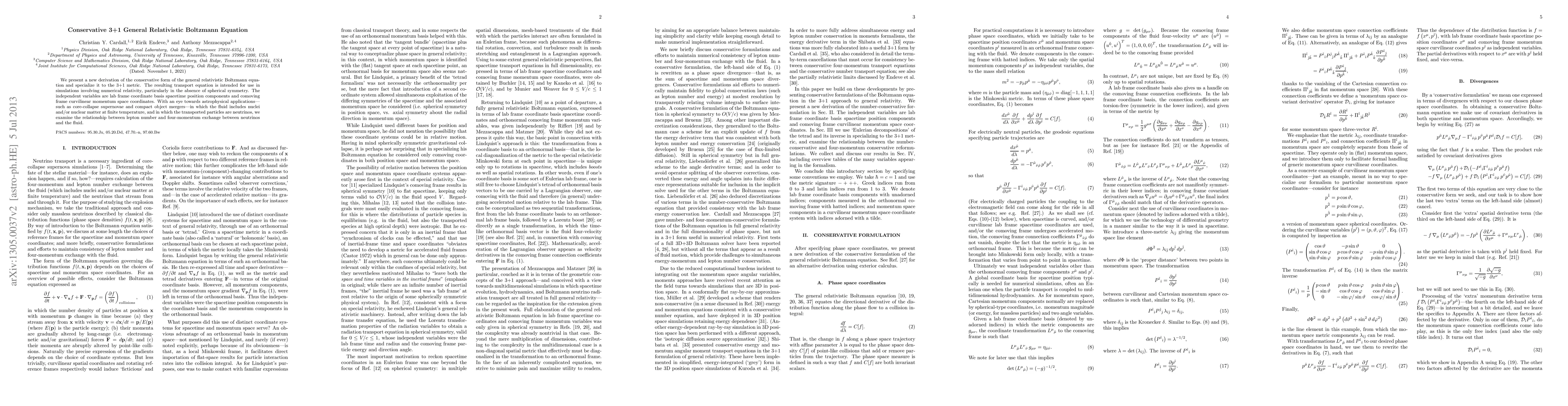 We present a new derivation of the conservative form of the general relativistic Boltzmann equation and specialize it to the 3+1 metric. The resulting transport equation is intended for use in simulations involving numerical relativity, particularly in the absence of spherical symmetry. The independent variables are lab frame coordinate basis spacetime position components and comoving frame curvilinear momentum space coordinates. With an eye towards astrophysical applications---such as core-collapse supernovae and compact object mergers---in which the fluid includes nuclei and/or nuclear matter at finite temperature, and in which the transported particles are neutrinos, we examine the relationship between lepton number and four-momentum exchange between neutrinos and the fluid.