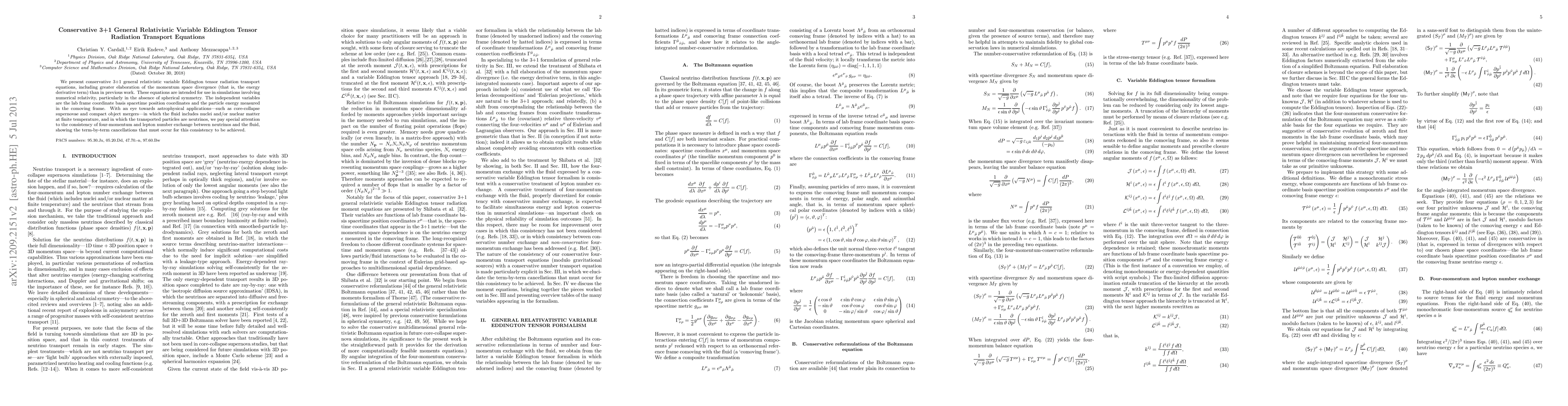 We present conservative 3+1 general relativistic variable Eddington tensor radiation transport equations, including greater elaboration of the momentum space divergence (that is, the energy derivative term) than in previous work. These equations are intended for use in simulations involving numerical relativity, particularly in the absence of spherical symmetry. The independent variables are the lab frame coordinate basis spacetime position coordinates and the particle energy measured in the comoving frame. With an eye towards astrophysical applications---such as core-collapse supernovae and compact object mergers---in which the fluid includes nuclei and/or nuclear matter at finite temperature, and in which the transported particles are neutrinos, we pay special attention to the consistency of four-momentum and lepton number exchange between neutrinos and the fluid, showing the term-by-term cancellations that must occur for this consistency to be achieved.