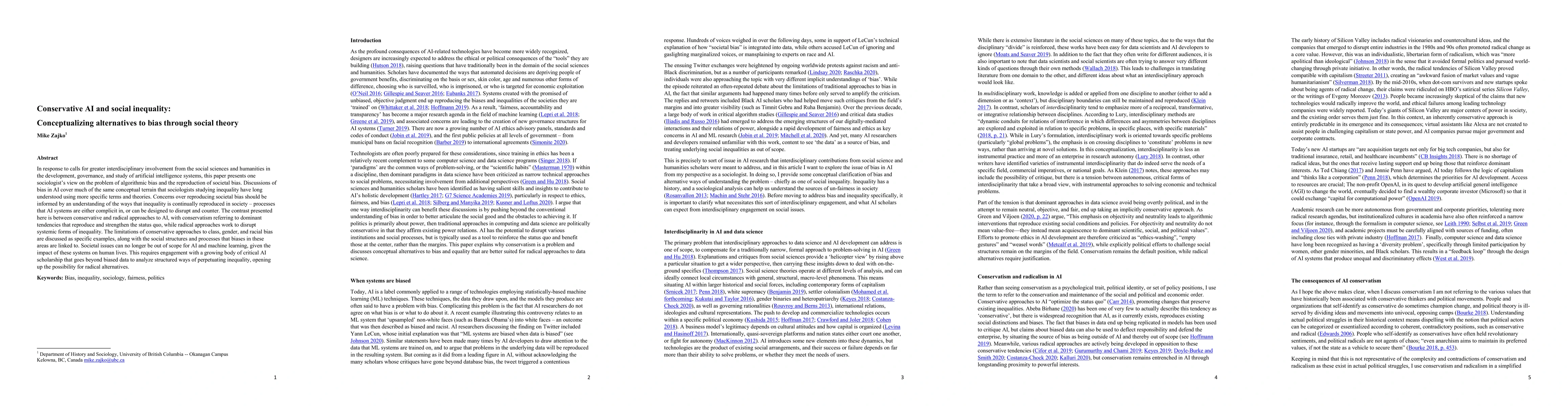 This paper explores the reproduction of societal bias in AI systems through a sociological lens, contrasting conservative approaches that perpetuate inequality with radical alternatives that aim to disrupt systemic biases. It emphasizes the need for interdisciplinary engagement to address the impact of AI on social inequality.