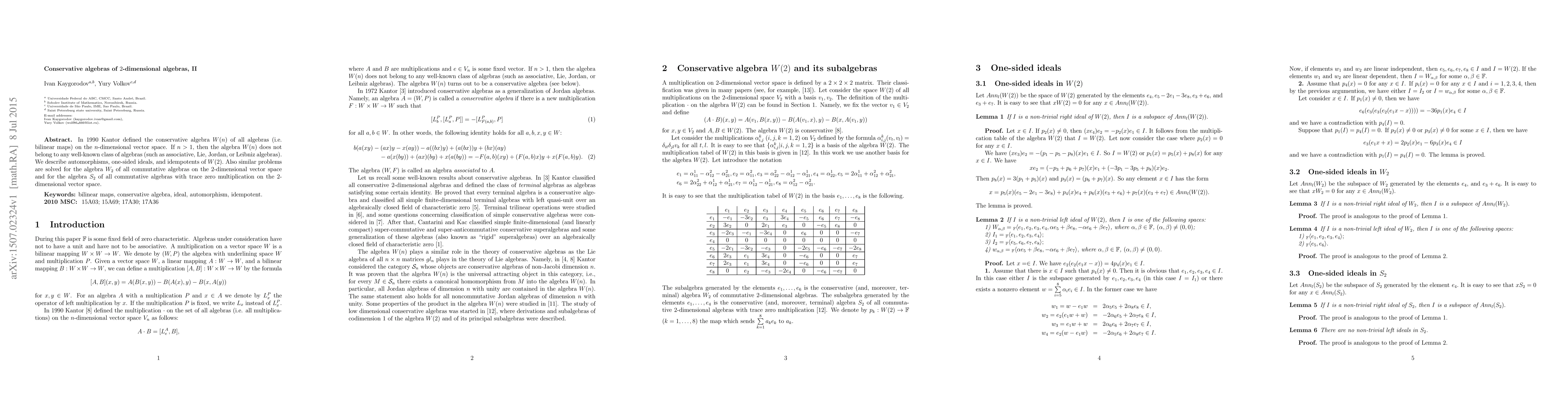 This paper investigates algebras of 2-dimensional vector spaces, including conservative algebras W(n) and commutative algebras with specific properties, exploring their automorphisms, ideals, and idempotents.