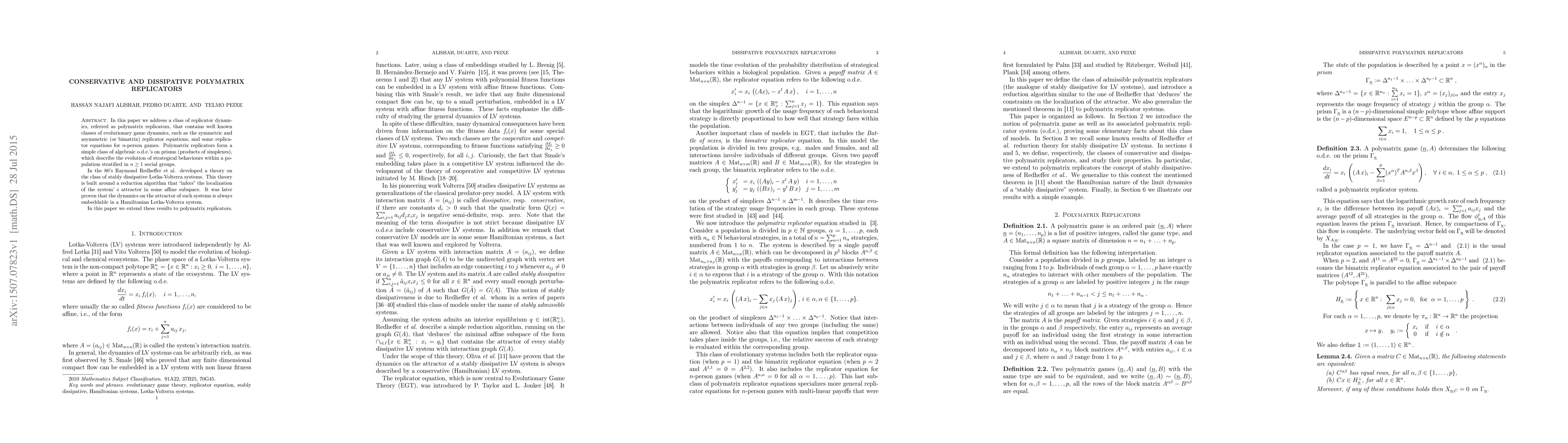 The paper extends the theory of stably dissipative Lotka-Volterra systems to polymatrix replicators, a class containing symmetric, asymmetric, and n-person game replicator equations.