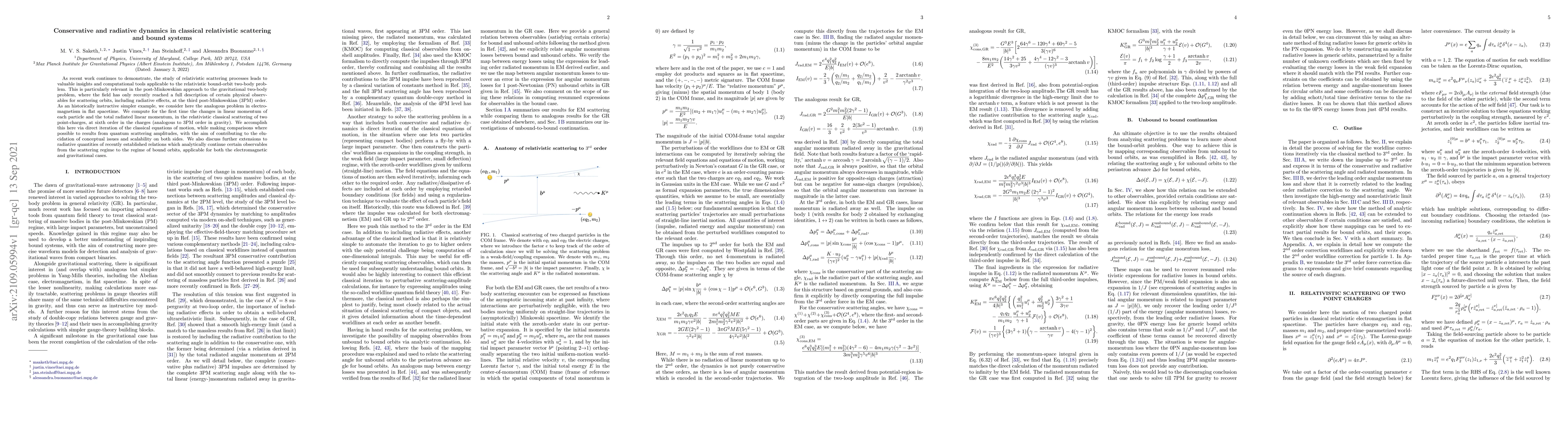 As recent work continues to demonstrate, the study of relativistic scattering processes leads to valuable insights and computational tools applicable to the relativistic bound-orbit two-body problem. This is particularly relevant in the post-Minkowskian approach to the gravitational two-body problem, where the field has only recently reached a full description of certain physical observables for scattering orbits, including radiative effects, at the third post-Minkowskian (3PM) order. As an historically instructive simpler example, we consider here the analogous problem in electromagnetism in flat spacetime. We compute for the first time the changes in linear momentum of each particle and the total radiated linear momentum, in the relativistic classical scattering of two point-charges, at sixth order in the charges (analogous to 3PM order in gravity). We accomplish this here via direct iteration of the classical equations of motion, while making comparisons where possible to results from quantum scattering amplitudes, with the aim of contributing to the elucidation of conceptual issues and scalability on both sides. We also discuss further extensions to radiative quantities of recently established relations which analytically continue certain observables from the scattering regime to the regime of bound orbits, applicable for both the electromagnetic and gravitational cases.