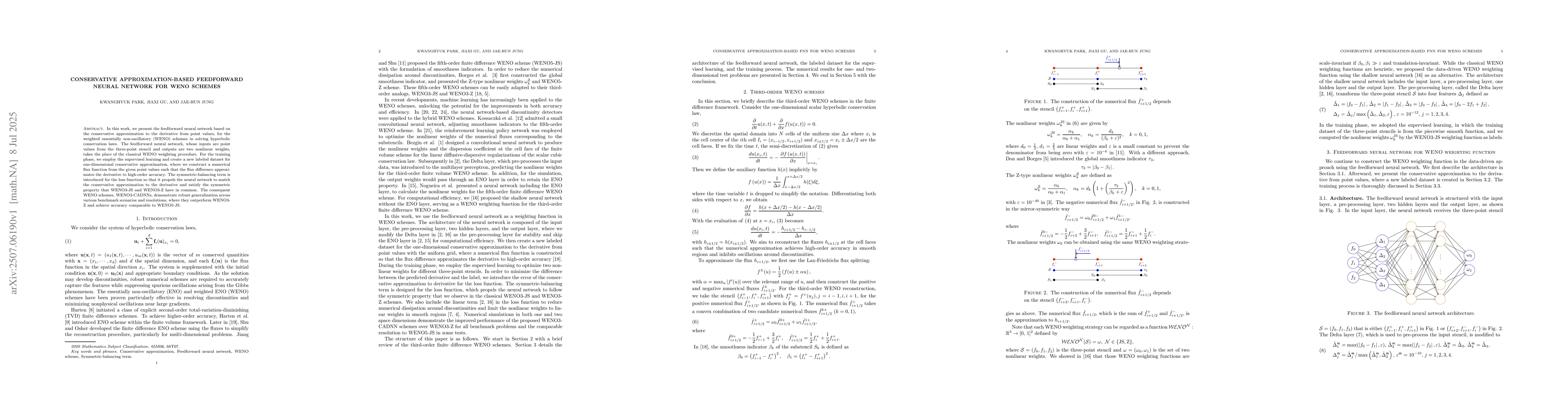 The research presents a feedforward neural network based on conservative approximation for WENO schemes, trained via supervised learning on a labeled dataset created from one-dimensional conservative approximations of derivatives. The network's input consists of four-point stencils sampled from both smooth and discontinuous functions, with labels determined by stencil regularity.