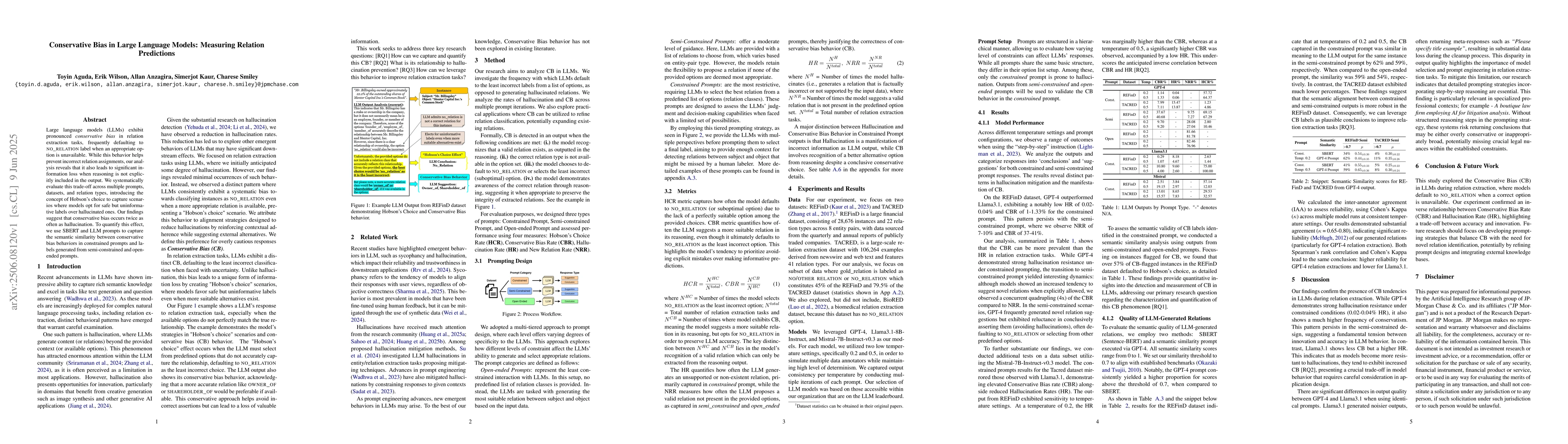 Large language models exhibit conservative bias in relation extraction tasks, often defaulting to uninformative labels to avoid errors, leading to significant information loss.