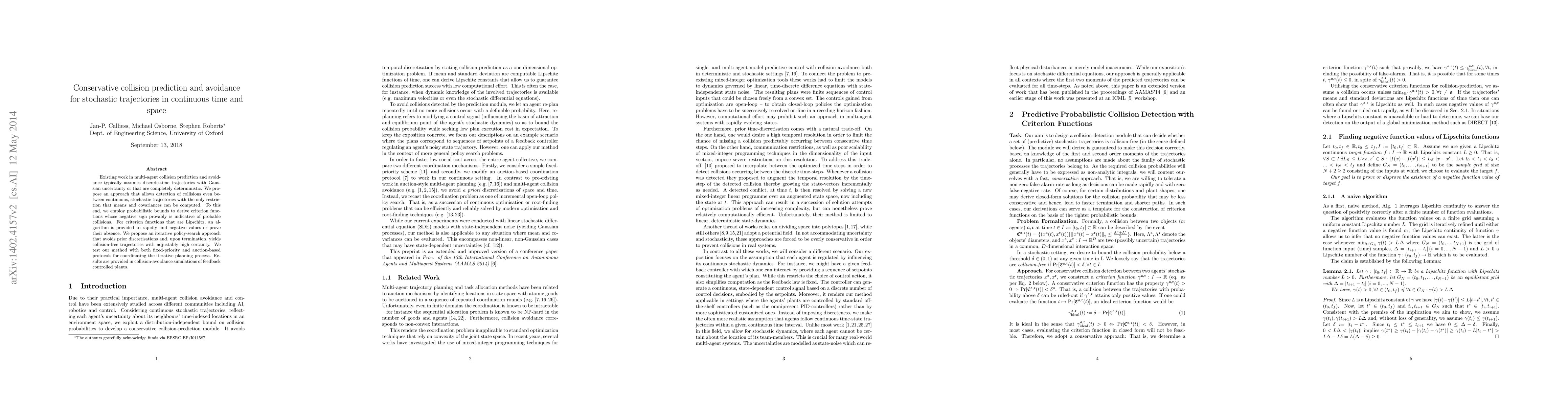 This paper proposes a novel method for predicting and avoiding collisions among continuous, stochastic trajectories in continuous time and space, using probabilistic bounds and Lipschitz criterion functions. The approach avoids discretization and iteratively searches for collision-free trajectories with high certainty, tested through simulations with fixed-priority and auction-based coordination protocols.
