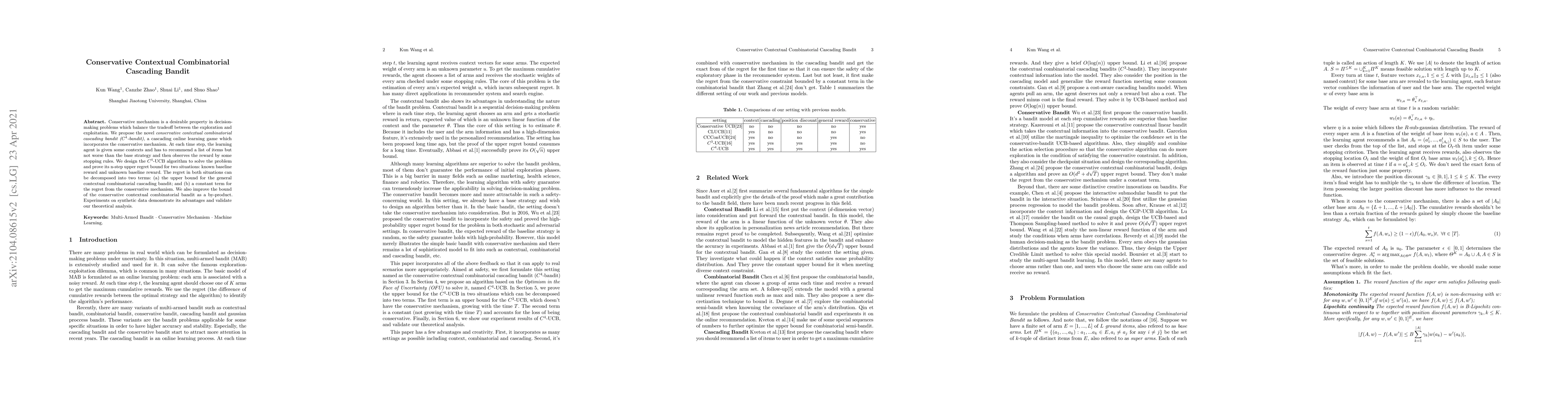 This paper proposes a novel conservative contextual combinatorial cascading bandit ($C^4$-bandit) mechanism that balances exploration and exploitation in online learning. The $C^4$-UCB algorithm is designed to solve this problem, with proven n-step upper regret bounds for both known and unknown baseline rewards, demonstrating advantages through synthetic data experiments.