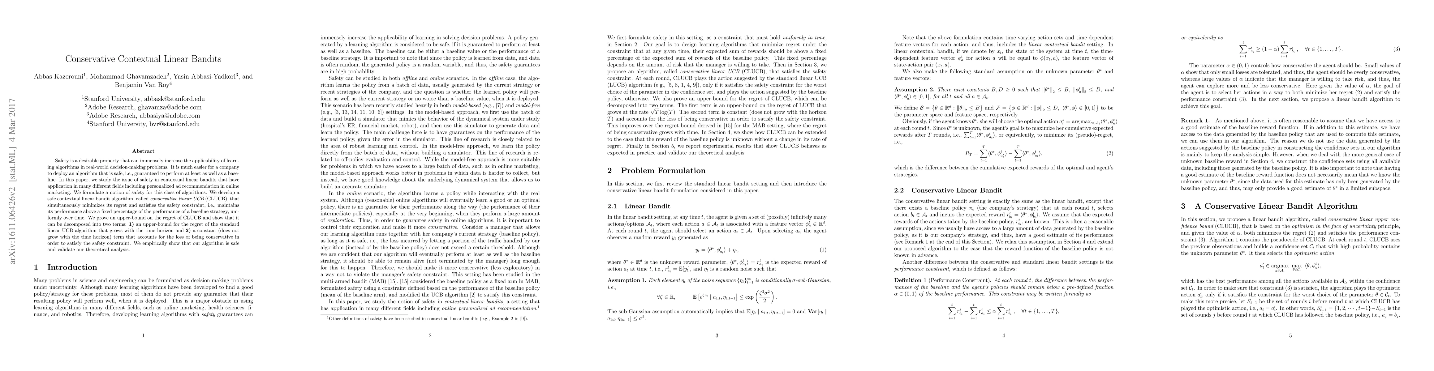 This paper introduces a safe contextual linear bandit algorithm called conservative linear UCB (CLUCB) that minimizes regret while ensuring performance above a baseline, thus enhancing real-world applicability. Theoretical analysis shows regret bounds, and empirical validation confirms the algorithm's safety and effectiveness.
