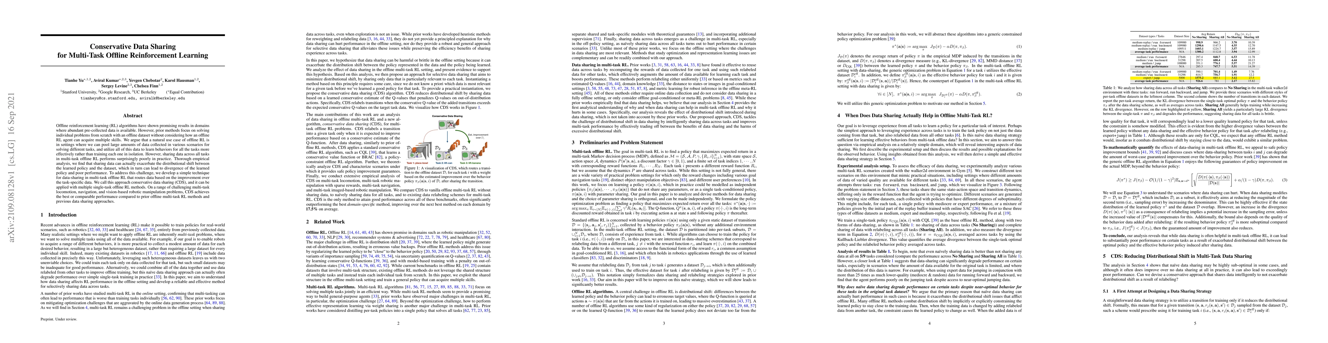 This paper proposes a conservative data sharing (CDS) technique for multi-task offline reinforcement learning, addressing the issue of distributional shift when sharing data across tasks. CDS routes data based on its improvement over task-specific data, achieving better or comparable performance on multi-task robotic problems compared to prior methods.