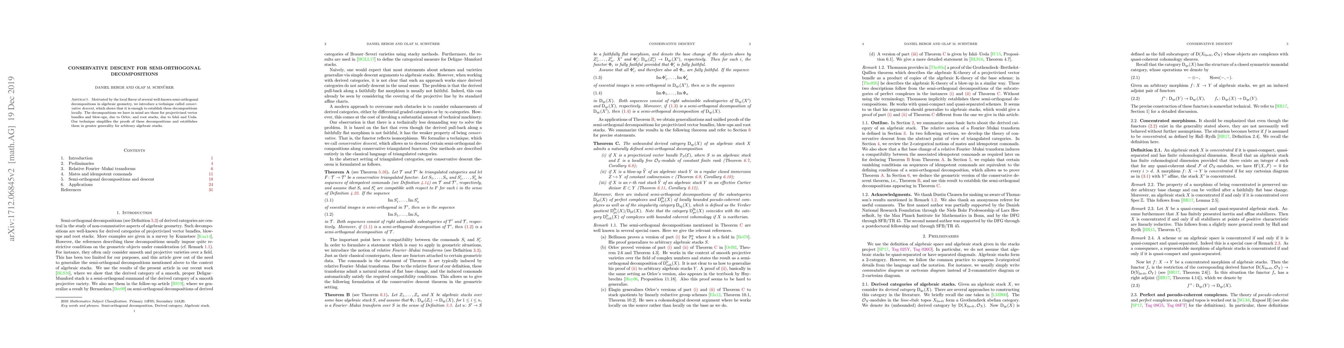 The paper introduces "conservative descent," a method that simplifies proofs for semi-orthogonal decompositions by establishing them locally, applicable to decompositions for vector bundles, blow-ups, and root stacks in algebraic geometry, thereby extending these results to arbitrary algebraic stacks.