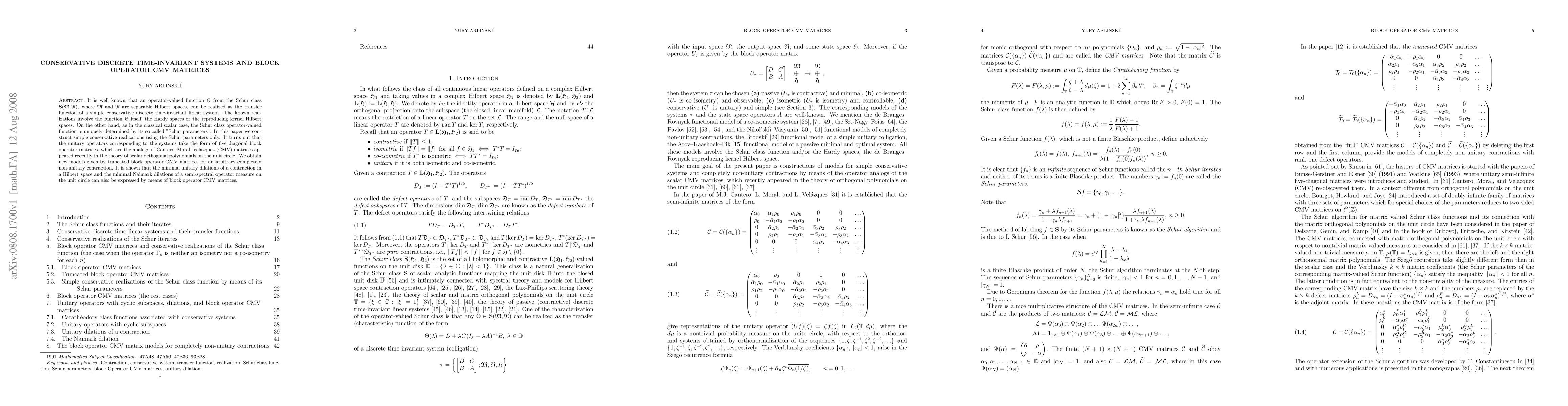 It is well known that an operator-valued function $\Theta$ from the Schur class ${\bf S}(\mathfrak M,\mathfrak N)$, where $\mathfrak M$ and $\mathfrak N$ are separable Hilbert spaces, can be realized as the transfer function of a simple conservative discrete time-invariant linear system. The known realizations involve the function $\Theta$ itself, the Hardy spaces or the reproducing kernel Hilbert spaces. On the other hand, as in the classical scalar case, the Schur class operator-valued function is uniquely determined by its so called "Schur parameters". In this paper we construct simple conservative realizations using the Schur parameters only. It turns out that the unitary operators corresponding to the systems take the form of five diagonal block operator matrices, which are the analogs of Cantero--Moral--Vel\'azquez (CMV) matrices appeared recently in the theory of scalar orthogonal polynomials on the unit circle. We obtain new models given by truncated block operator CMV matrices for an arbitrary completely non-unitary contraction. It is shown that the minimal unitary dilations of a contraction in a Hilbert space and the minimal Naimark dilations of a semi-spectral operator measure on the unit circle can also be expressed by means of block operator CMV matrices.