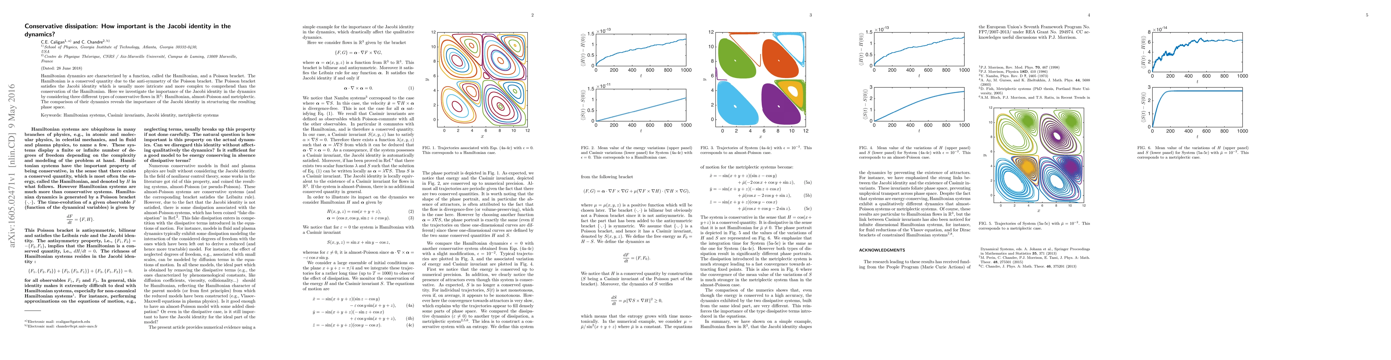 The paper investigates how the Jacobi identity affects conservative dynamics in three types of flows: Hamiltonian, almost-Poisson, and metriplectic, highlighting its importance in structuring phase space.