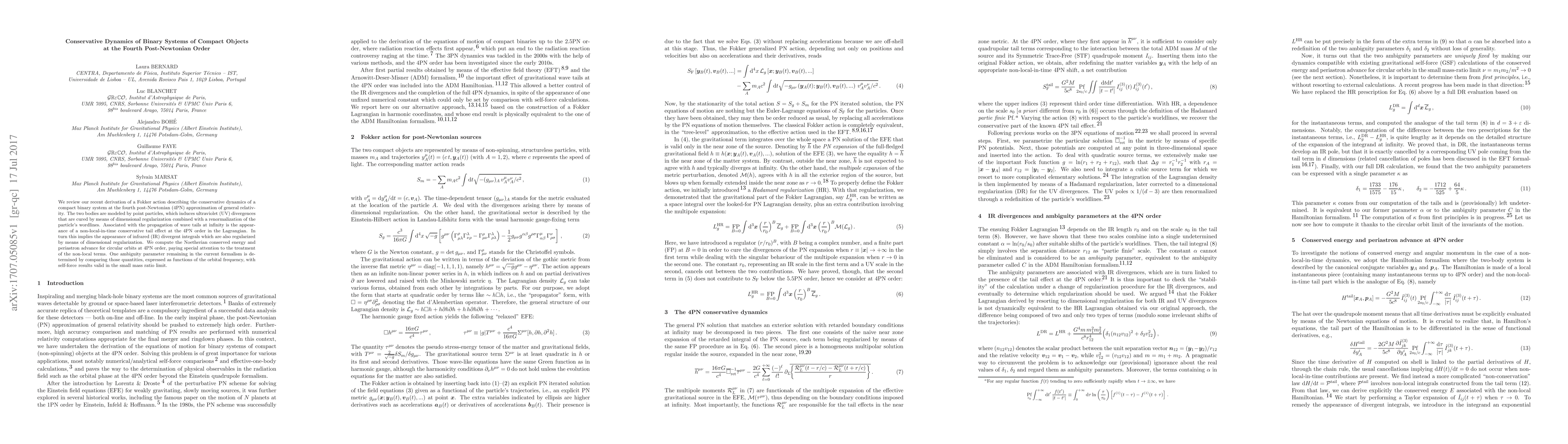 We review our recent derivation of a Fokker action describing the conservative dynamics of a compact binary system at the fourth post-Newtonian (4PN) approximation of general relativity. The two bodies are modeled by point particles, which induces ultraviolet (UV) divergences that are cured by means of dimensional regularization combined with a renormalization of the particle's wordlines. Associated with the propagation of wave tails at infinity is the appearance of a non-local-in-time conservative tail effect at the 4PN order in the Lagrangian. In turn this implies the appearance of infrared (IR) divergent integrals which are also regularized by means of dimensional regularization. We compute the Noetherian conserved energy and periastron advance for circular orbits at 4PN order, paying special attention to the treatment of the non-local terms. One ambiguity parameter remaining in the current formalism is determined by comparing those quantities, expressed as functions of the orbital frequency, with self-force results valid in the small mass ratio limit.