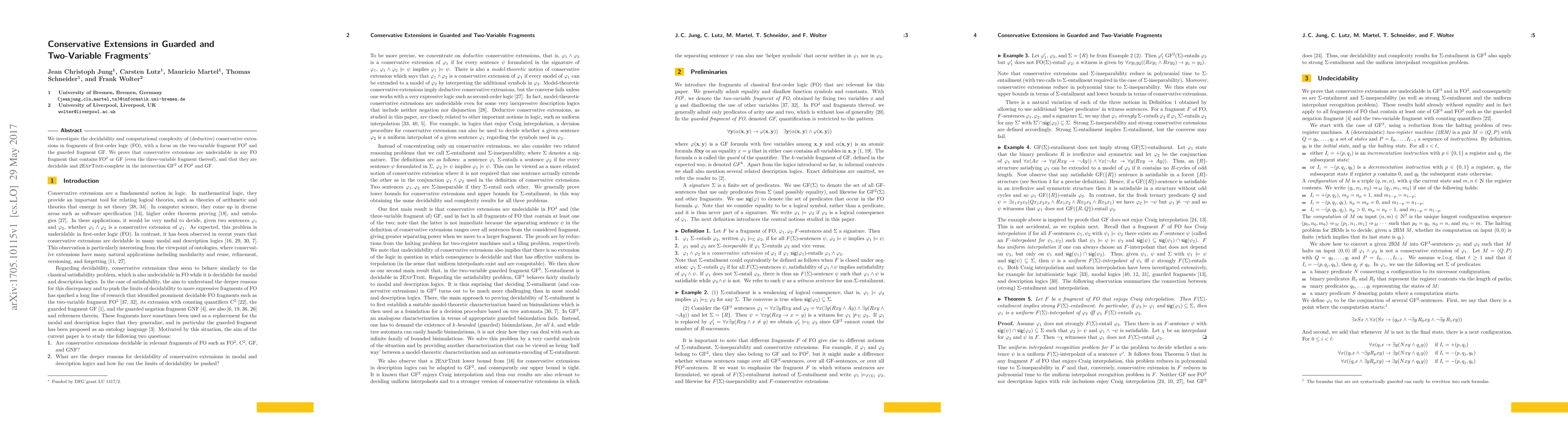 This paper explores the decidability and complexity of conservative extensions in fragments of first-order logic, specifically focusing on FO$^2$ and GF. It concludes that conservative extensions are undecidable in FO fragments containing FO$^2$ or GF, but decidable and 2\ExpTime-complete in the intersection GF$^2$.