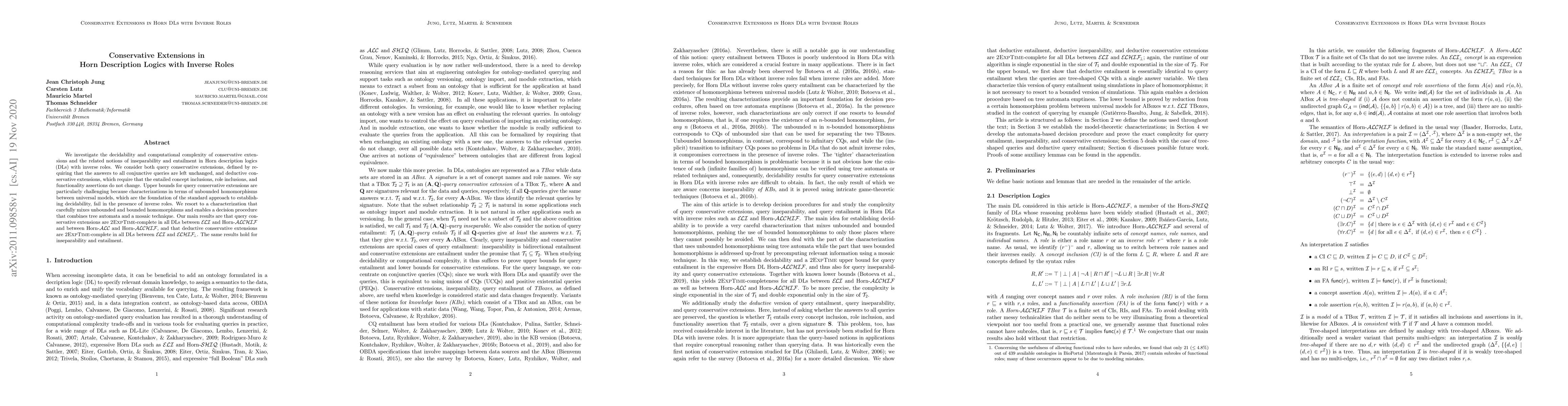 This paper explores the decidability and complexity of conservative extensions in Horn description logics with inverse roles, showing that query conservative extensions are 2ExpTime-complete for certain DLs, while deductive conservative extensions are also 2ExpTime-complete for others, employing a novel approach combining tree automata and a mosaic technique.