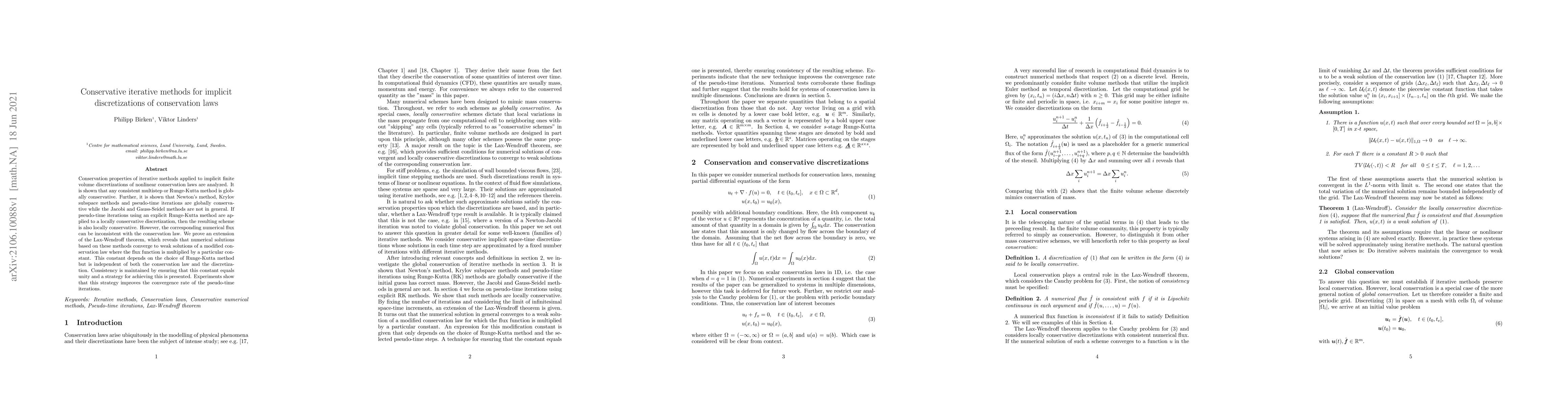 Conservation properties of iterative methods applied to implicit finite volume discretizations of nonlinear conservation laws are analyzed. It is shown that any consistent multistep or Runge-Kutta method is globally conservative. Further, it is shown that Newton's method, Krylov subspace methods and pseudo-time iterations are globally conservative while the Jacobi and Gauss-Seidel methods are not in general. If pseudo-time iterations using an explicit Runge-Kutta method are applied to a locally conservative discretization, then the resulting scheme is also locally conservative. However, the corresponding numerical flux can be inconsistent with the conservation law. We prove an extension of the Lax-Wendroff theorem, which reveals that numerical solutions based on these methods converge to weak solutions of a modified conservation law where the flux function is multiplied by a particular constant. This constant depends on the choice of Runge-Kutta method but is independent of both the conservation law and the discretization. Consistency is maintained by ensuring that this constant equals unity and a strategy for achieving this is presented. Experiments show that this strategy improves the convergence rate of the pseudo-time iterations.