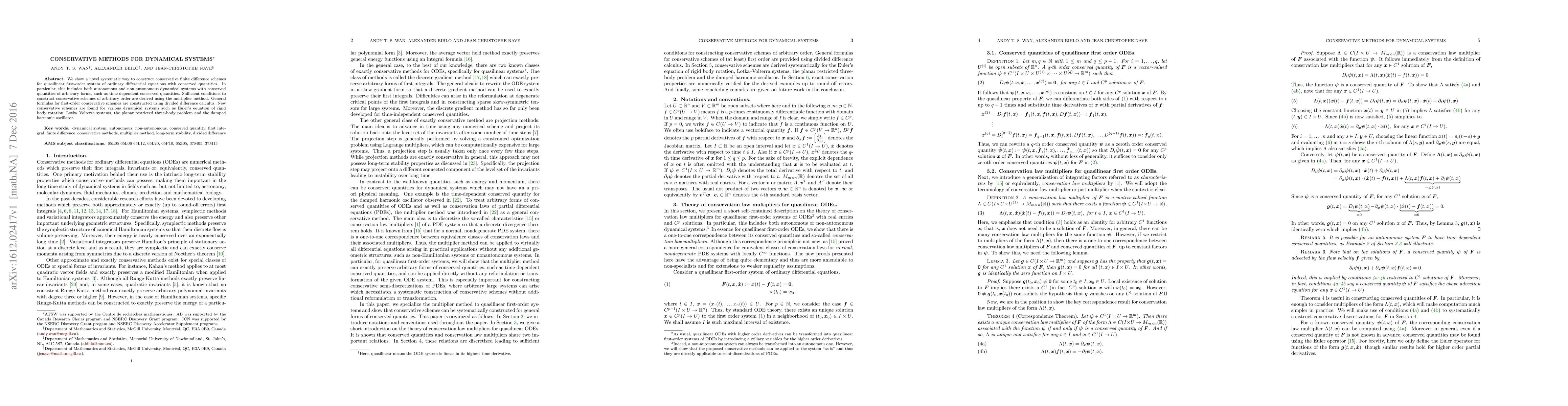 We show a novel systematic way to construct conservative finite difference schemes for quasilinear first-order system of ordinary differential equations with conserved quantities. In particular, this includes both autonomous and non-autonomous dynamical systems with conserved quantities of arbitrary forms, such as time-dependent conserved quantities. Sufficient conditions to construct conservative schemes of arbitrary order are derived using the multiplier method. General formulas for first-order conservative schemes are constructed using divided difference calculus. New conservative schemes are found for various dynamical systems such as Euler's equation of rigid body rotation, Lotka-Volterra systems, the planar restricted three-body problem and the damped harmonic oscillator.