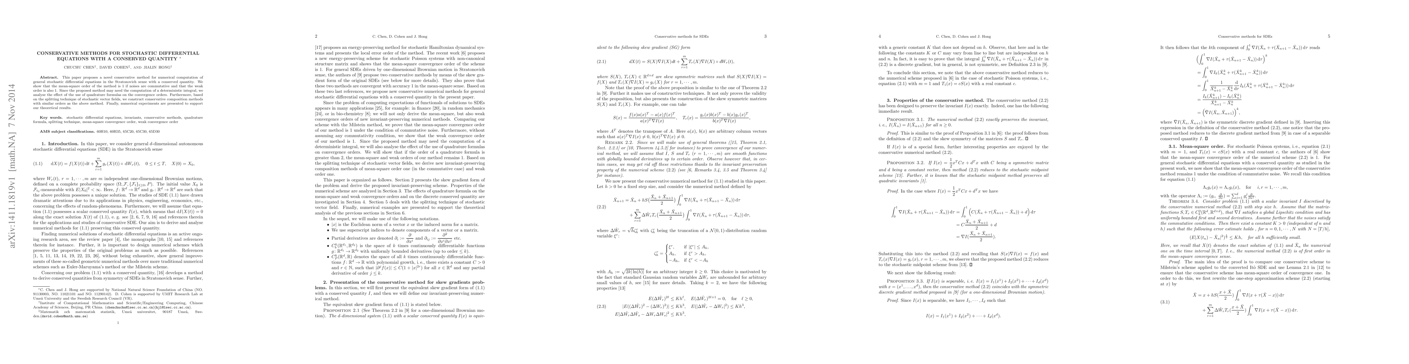 This paper introduces a conservative numerical method for solving stochastic differential equations with conserved quantities, achieving mean-square and weak order 1 under commutative noise conditions. It also examines the impact of quadrature formulas on convergence and constructs conservative composition methods using the splitting technique. Numerical experiments validate the theoretical findings.