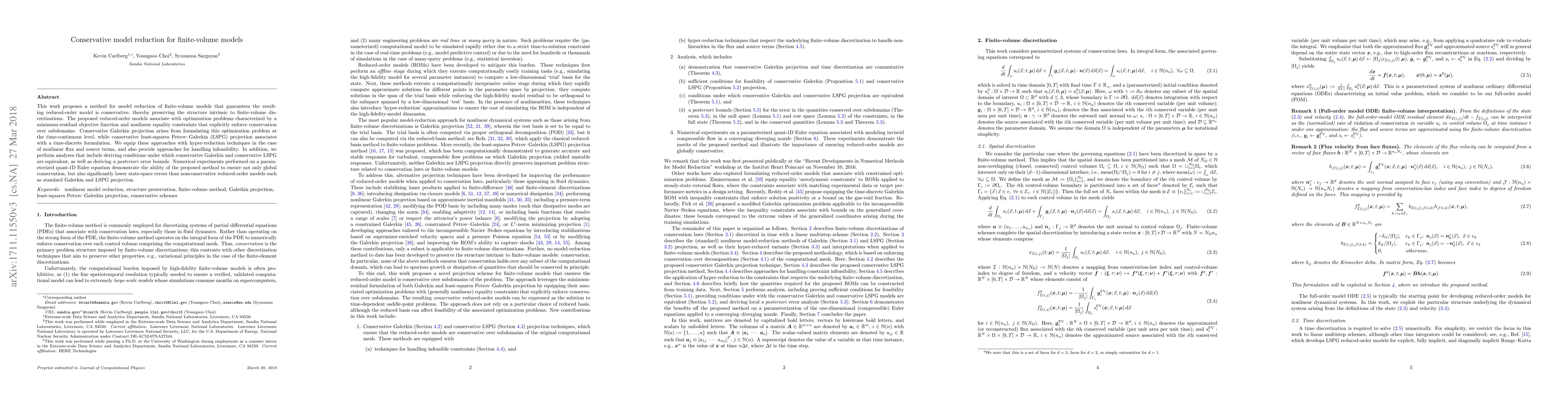This work proposes a method for model reduction of finite-volume models that guarantees the resulting reduced-order model is conservative, thereby preserving the structure intrinsic to finite-volume discretizations. The proposed reduced-order models associate with optimization problems characterized by a minimum-residual objective function and nonlinear equality constraints that explicitly enforce conservation over subdomains. Conservative Galerkin projection arises from formulating this optimization problem at the time-continuous level, while conservative least-squares Petrov--Galerkin (LSPG) projection associates with a time-discrete formulation. We equip these approaches with hyper-reduction techniques in the case of nonlinear flux and source terms, and also provide approaches for handling infeasibility. In addition, we perform analyses that include deriving conditions under which conservative Galerkin and conservative LSPG are equivalent, as well as deriving a posteriori error bounds. Numerical experiments performed on a parameterized quasi-1D Euler equation demonstrate the ability of the proposed method to ensure not only global conservation, but also significantly lower state-space errors than nonconservative reduced-order models such as standard Galerkin and LSPG projection.