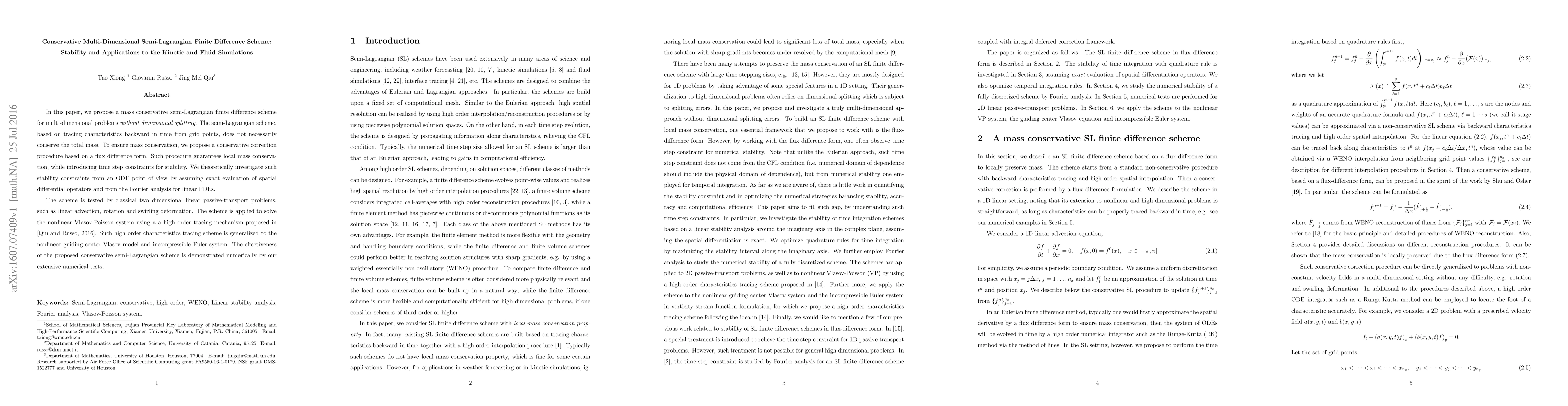 This paper proposes a mass conservative semi-Lagrangian finite difference scheme for multi-dimensional simulations, ensuring local mass conservation through a correction procedure. The scheme is tested on linear problems and applied to nonlinear systems like the Vlasov-Poisson system and incompressible Euler equations, demonstrating its effectiveness.