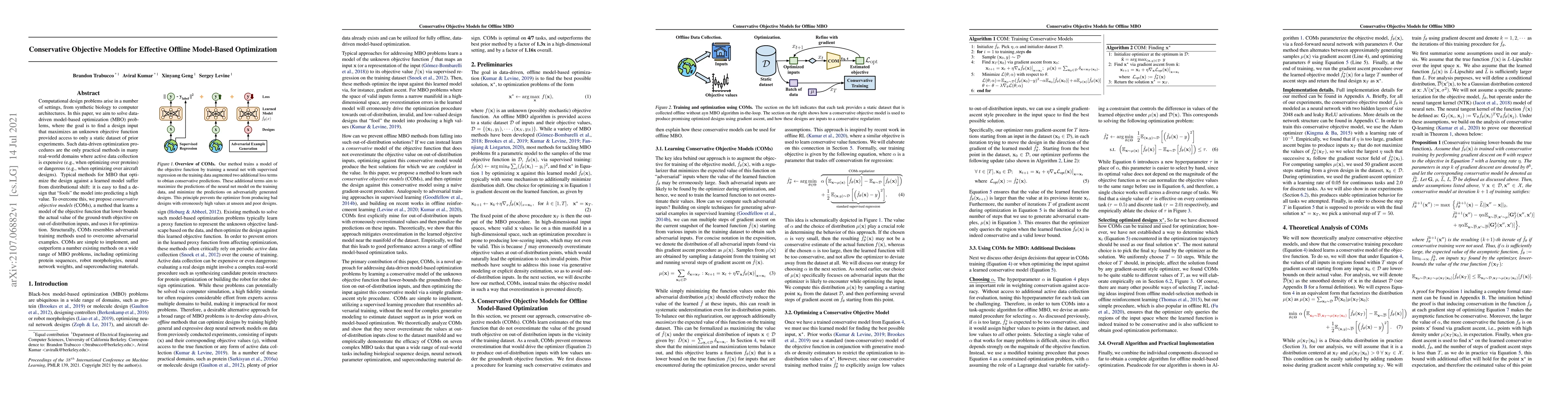 This paper proposes conservative objective models (COMs) to solve data-driven model-based optimization (MBO) problems by learning a lower bound on the objective function to mitigate distributional shift. COMs outperform existing methods across various MBO applications, including protein sequences and neural network weights.